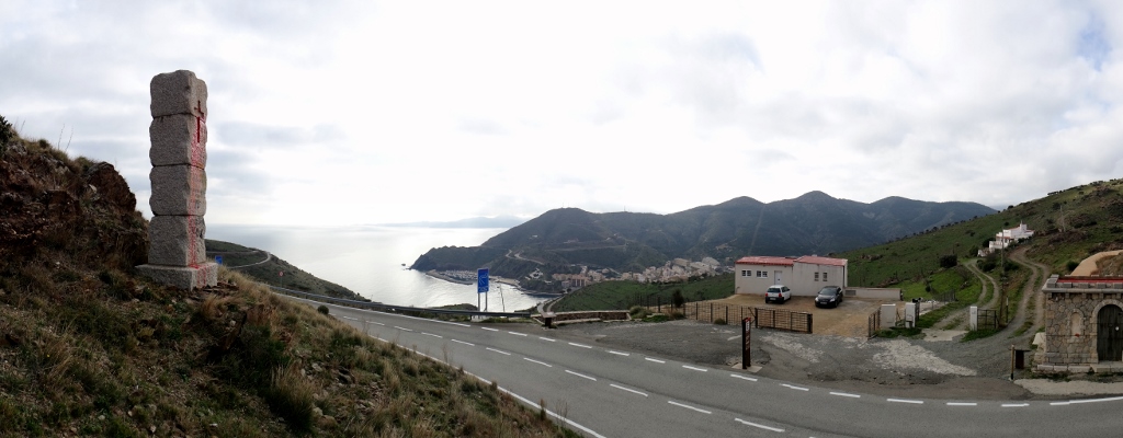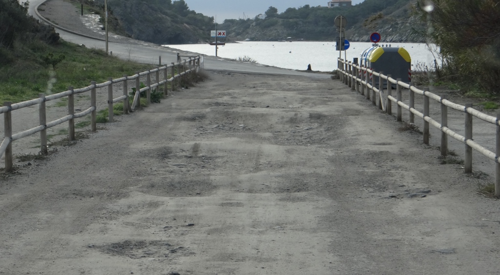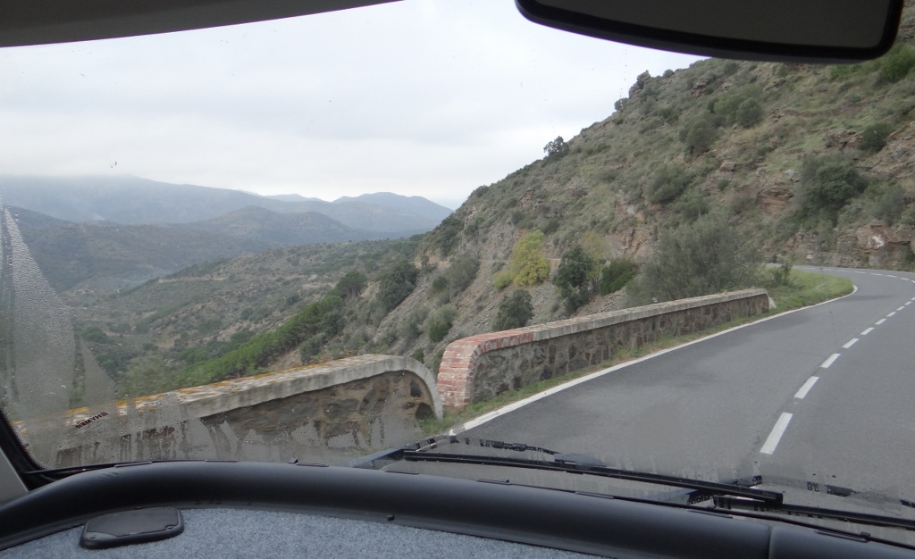 Back on track, sorry, sorry. We made a half-hearted attempt to get to the Cap de Creus as we ventured out of Portlligat. The first ‘no motorhomes’ sign was ignored. The second one was accompanied by a rapidly narrowing road and we bottled it. Neither of us much fancied the walk, partly down to the thick cloud above, so we spun Zagan and headed back through Cadaqués, and along the white roads out of there. Rocket-powered fruit delivery vans flashed past, unaware of the ‘dentist drill’ effect they were having on my nerves. I can judge Zagan’s width quite well on straight roads, down to a few inches, but I use ‘markers’ on the windscreen to do it, which don’t work on corners. The road out of Cadaqués is about 98% corner. Much flinching ensued.