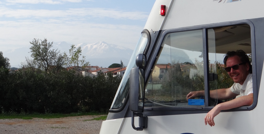 Zagan the motorhome has the Everest-like shadow of the Pic du Canigou looming in his passenger window, the descending sun’s lighting clouds above it blood red as though it’s gone volcanic in rage. We’re back in the bosom of France, ensconced behind the buildings of a fabulous motorhome-hugging, olive farming family in Trouillas, Langedoc-Roussillon, south of France (N42.61506 E2.81487).