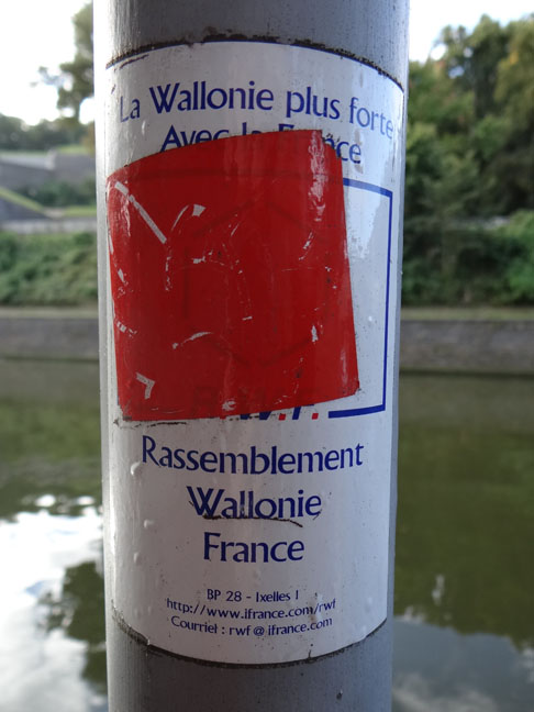 Namur’s nearby citadel called out from high, we answered, walking straight for it along the waterway until the lure of a heaving Saturday morning market proved too strong. Southern Belgium feels to me like a long lost part of France, not just the language, but other things. A lamppost sticker appeared to say ‘we’d be better off if we were part of France lads’. A leaflet handed over to us angrily demands a minimum €1500/month pension, and a 75% of average salary (over the highest five years of the career) for private sector workers. The market stalls lay out immaculate fruit, cured meats, tiny-to-huge cheese families and, what’s this? Goats?