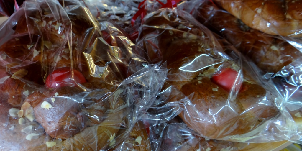 A quick stop in the most wonderful shop selling all sorts of things that are bad for you but yummy, including tsoureki (sweet bread loves with painted red eggs baked into the – the local version of Easter eggs) we bought some baklava and headed back to Dave to wait for lunch.