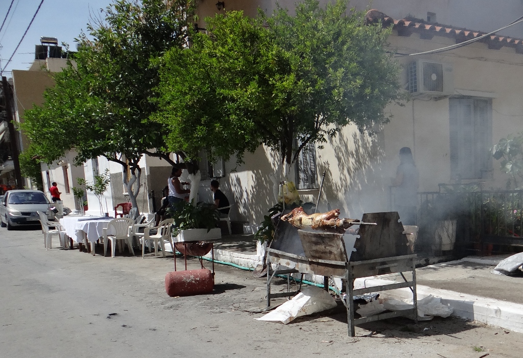 This morning we were woken by the sun heating up Dave, when it’s too hot in the bed it’s time to get up. Opening the windows to let in fresh air we were greeted with the aroma of roasting lamb. After breakfast we went for a walk around the town, it was deserted, so we headed up the whitewashed steps into the old town. Every tiny balcony was filled with families laughing and chatting as a lamb, or part of one, rotated on a spit often wrapped in tinfoil. They smiled and greeted us, one lady rushed over from her conversation to make cooing noises at Charlie. Back at street level the air was thick with smoke as BBQ’s stood in the street, plastic tables and chairs next to them ready for the family feast.