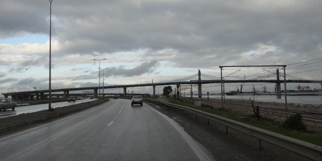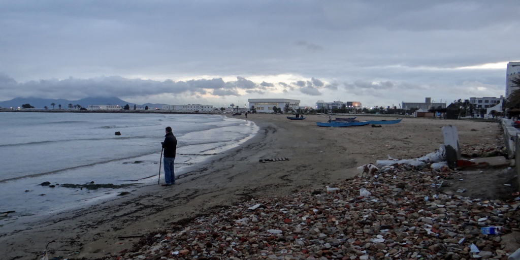 A left turn found us at the train station we had arrived at in Tunis yesterday, and another turn took us out onto the causeway crossing Lac Tunis. Rounding in on the port it was still only 5pm, so we opted to park outside the police station where we’d spent a few hours on our first night. This gave Charlie his final African beach walk – stones in hand to scare off the wild dogs – and us time to relax and reflect a bit.