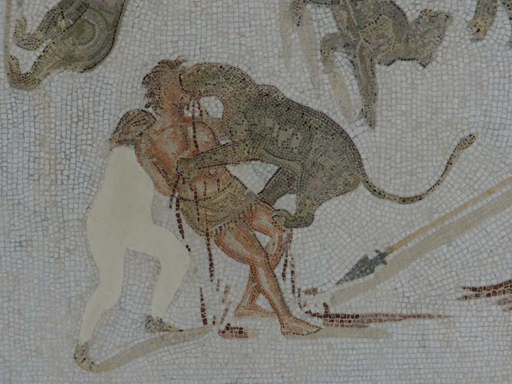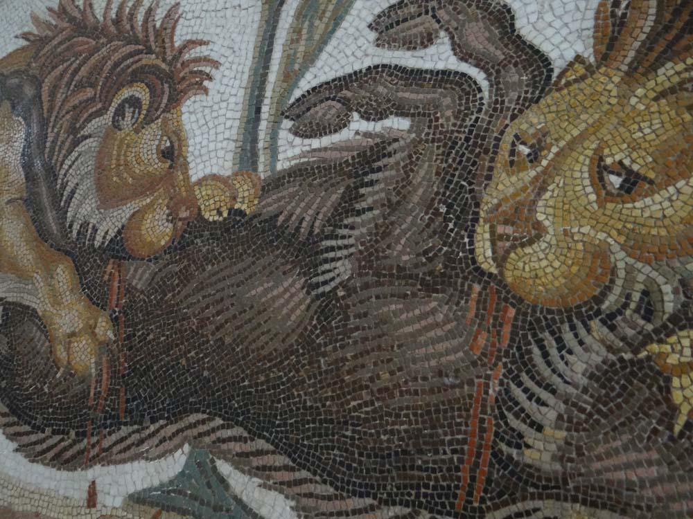 A few pictures of the mosaics in the museum follow. They were magnificent, and I can now understand why museums in Italy and here lift them from their original placing; there’s no money to look after them otherwise, they’d crumble to nothing. The museum has even shifted an entire villa from the centre of the town and rebuilt it next door, to ensure it can be maintained (they added a few bits too as far as I can tell!).