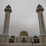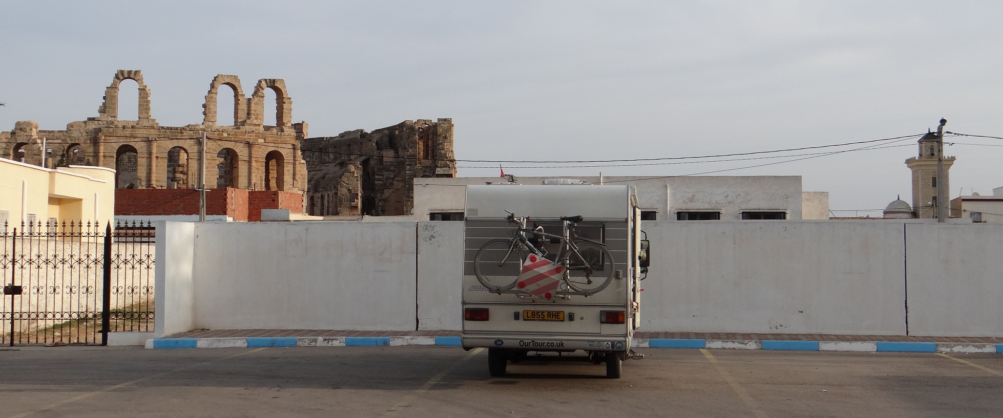 Dave the motorhome is surrounded by eight foot blank walls, over which peep the upper layers of the El Jem amphitheatre (N35.29750 E10.70519). We’re in the town’s municipal car park, and the guardian chap has just arrived (no-one was here to take cash for the first few hours), cost for the night: 2TD, about €1. Ju’s now having a panic as he’s closed the main gates, possibly precluding her plan to get takeaway pizza for the night. As it’s her turn to cook, this means she may have to cook, unlucky.
