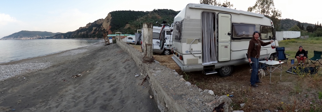 Dave the motorhome is behind locked gates, he didn’t know they were going to be locked but he is feeling quite secure about it (N36.77632 E22.56667). He’s parked up next to a closed beach bar just north of Gytheio (which has numerous translations for how it is spelled in Greek, our guidebooks and maps can’t decide on Gythio, Gytheio, Yithio and a few other combinations.