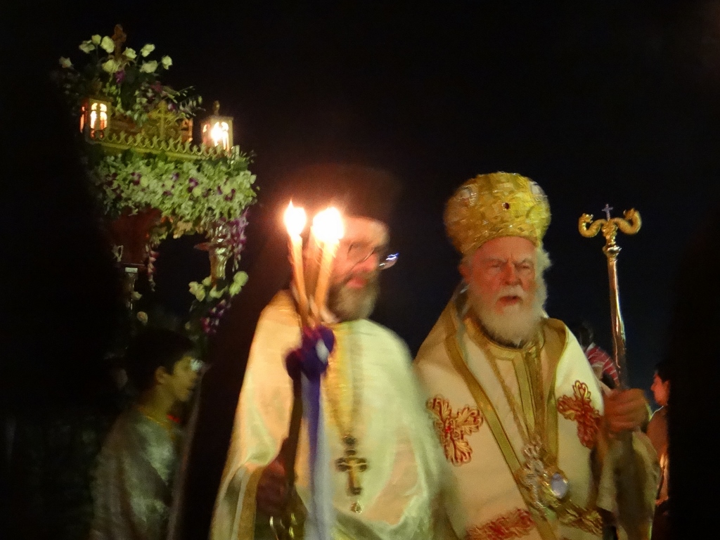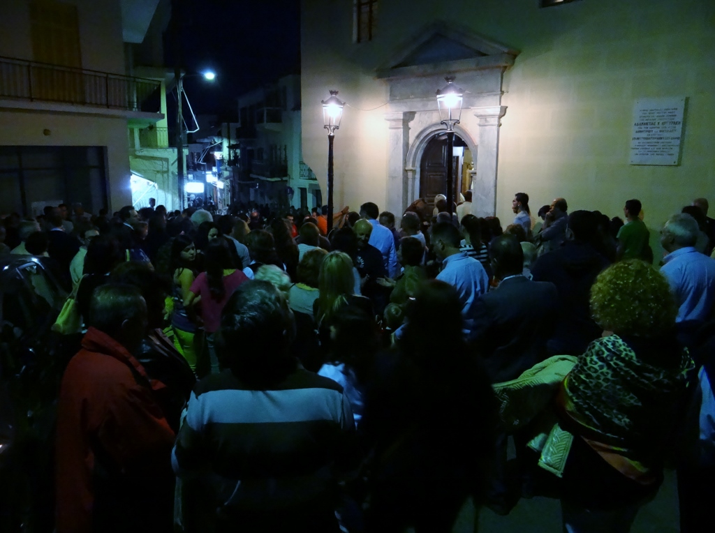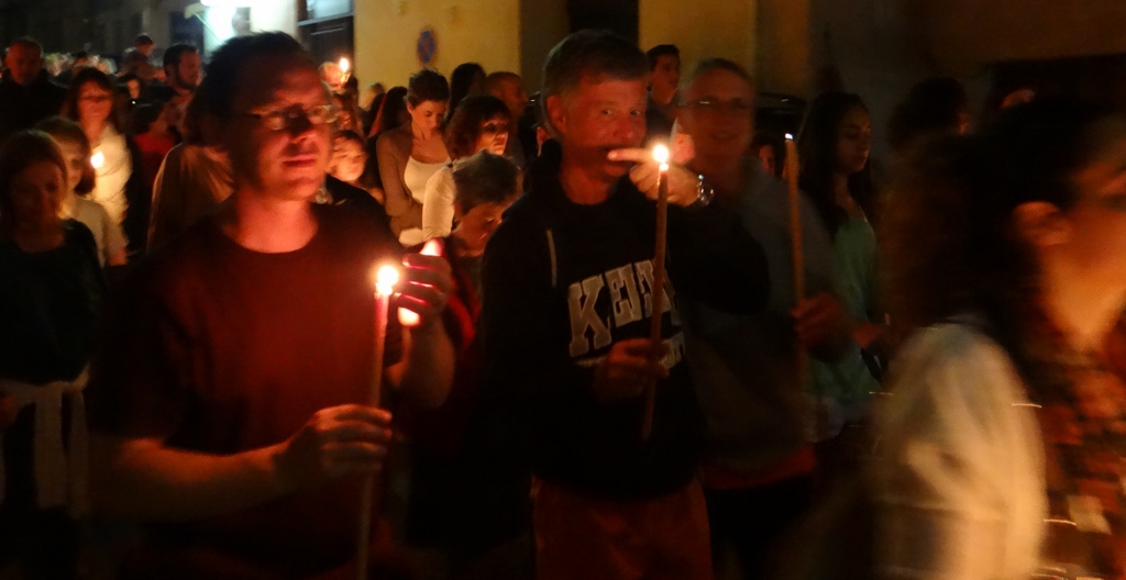 I stayed outside with Charlie while the others went to investigate what was going on inside. The icon of Christ had been taken off the cross in the church and was wrapped in linen and placed in a casket covered in flowers. The casket symbolising the tomb of Christ would be carried through the streets by the faithful in the “Procession of the Epitáphios of Christ”. Jay, Jacqui and Mike returned with some long candles ready to join in the procession.