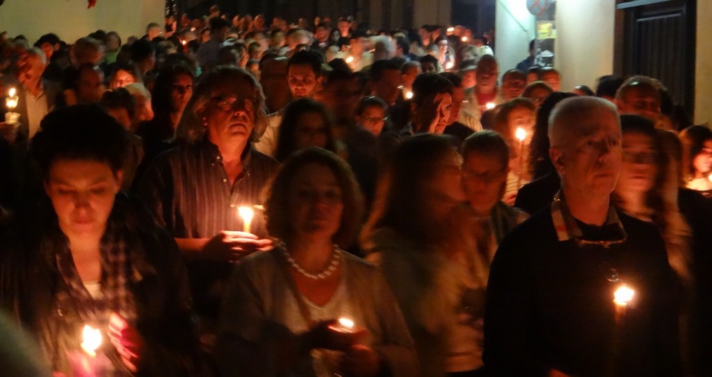 As the sun began to set the lights of the town came on along the bay and we set off to see what was happening in town. We could hear a church service being broadcast on loud speakers and followed the noise and crowds. Up a side road we walked towards the church that was the source of the service, waiting outside were a brass band, soldiers in uniform lined the street and a crowd was gathered all holding candles.