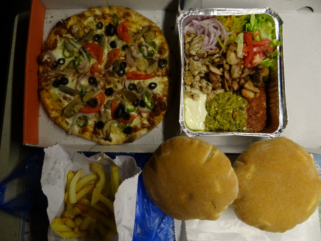 Last night all the gates were locked for our car park at El Jem, but one side of the car park was an entrance to a bar, and we could escape on foot through it. We ventured out and made it all of 50m before we saw ‘Fun Food’ a new looking takeaway place. I ordered pizza, Jay went for the Mixte (mixed grill) and it was all freshly prepared in front of us as we sat under the TV showing a Tunisian drama (at least I assume it was a drama, the men in Fez type hats were looking very serious). Back in Dave we unpacked the brimming carrier bag. At just under 10TD (€5) in total we both ate very, very well.