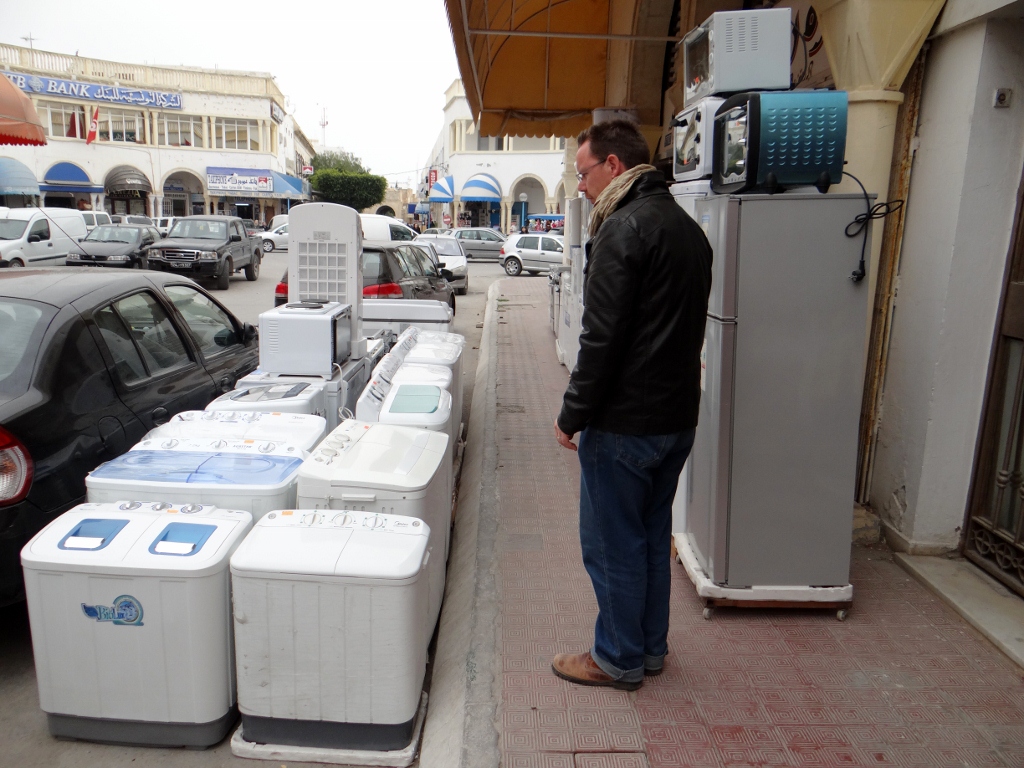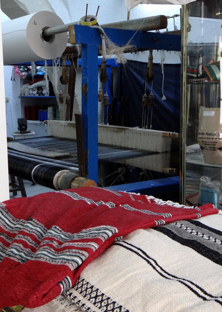 We’d heard the thud, thud, of the looms being worked as we’d walked around the medina, I decided this was the place to buy a souvenir or two. Walking past the main shops we found one with looms in the back, so at least everything wasn’t bought in from China! I looked around for a short while pretending not to be too interested, the owner explaining in French how wonderful things were. Jay stood outside by the door translating for me. We found two blankets in the huge piles that we both liked, a cream cotton one and a red velour one (not sure if it’s cotton or synthetic, but it felt nice). The owner priced them up for us, 50TD for the cream ‘better quality’ one and 40TD for the red one. Jay asked the price for both and it came down to 80TD. A bit of fun haggling later with only one pretend threat to walk away and we left with the blankets for 70TD (€35). We probably paid quite a bit over the odds, but we’re happy with the price and so was the shop keeper – that’s the fun of haggling.