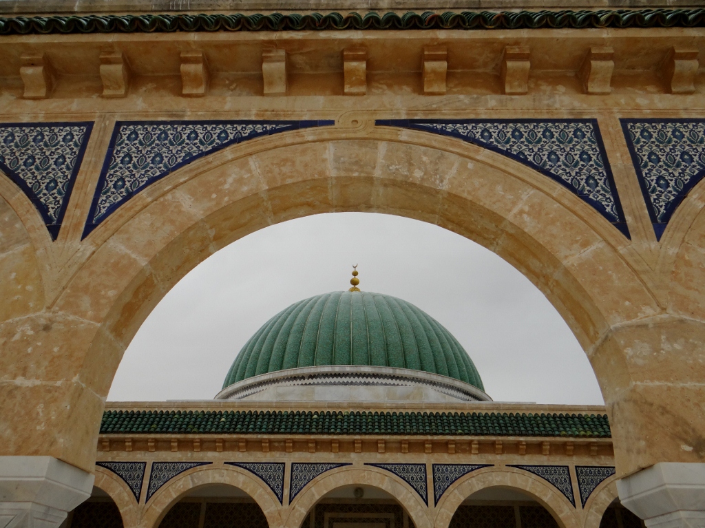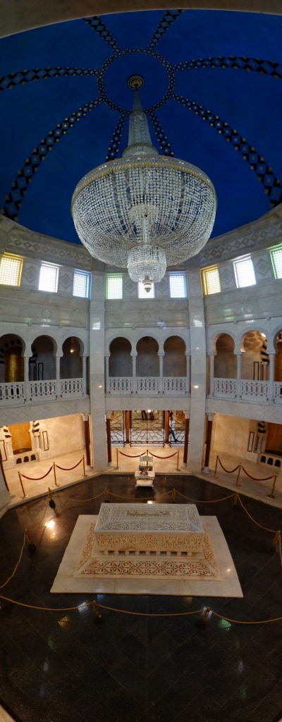 Walking inside the security guard followed us in and asked if we had any questions as we wandered around a room containing photographs, clothes and other items of Bourguiba’s. We were happy just looking so he wandered off and opened the locked gate into the main part of the building and ushered us in. Under the main dome of the building in a circular room Bourguiba’s body lies in a marble sarcophagus under a massive Italian chandelier. Two other domed rooms contain the resting places of his close family. It was a really beautiful place and strange to see it after weeks of passing dusty graveyards covered in blue plastic bags.