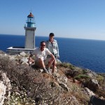 Dave the motorhome is surrounded by the sea as he sits on the quayside that juts out into the clear blue sea at Kotronas on the east coast of the Mani (N36.61839 E22.49446). Parked up in front of him are Mike and Jacqui who we met at Porto Kayio yesterday. Well, strictly speaking we met Mike at the car park at the end of the Mani, as we waited for the day to cool off enough for us to walk out to the lighthouse at Cape Tenaro, on our return from the lighthouse we joined them and their motorhome in Porto Kayio for the night. Hopefully that goes some way towards explaining Jay’s blog post from yesterday – it was written at 1am when he could barely make out the screen let alone the keyboard – beers, wine and a bottle of Ouzo had been devoured with our new friends.