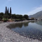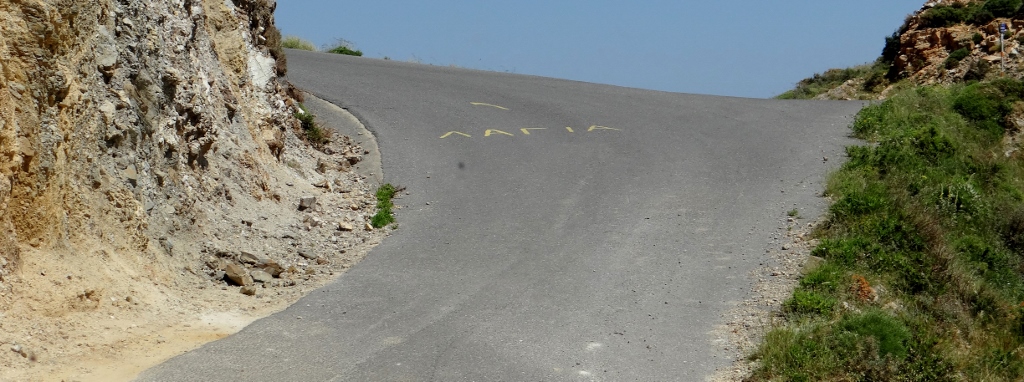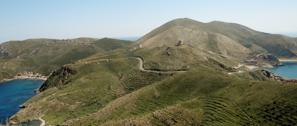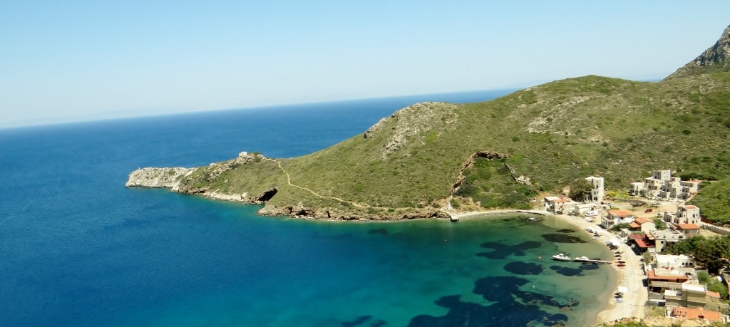We wound our way up the steep lane that leads down to Porto Kayio and by more luck than judgement (as our map only has one road on it for around here) I spotted a sign on the road for Layia – the direction we needed to go. The hill got progressively steeper as Dave was ushered into ’emergency’ first gear. Crawling to the top we were rewarded with a view back down over the end of the Mani; the Messenian Gulf on the right and the Laconian Gulf on the left of the narrow, undulating mass of land.