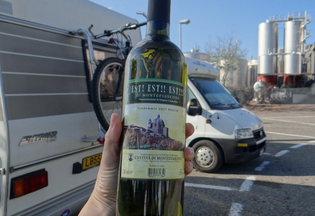 Est! Est!! Est!!! the local tipple. Dave is parked where we slept, the wine is made in those metal tanks behind us, bought from the shop next to the tanks!
