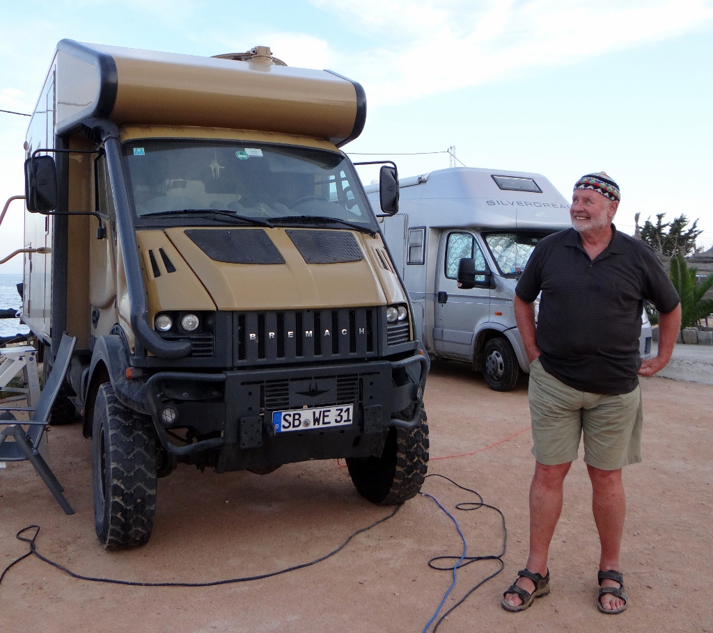 After a stroll along the beach Werner knocked on our door asking me to come and look at some vegetables. He’s prepared several pans worth, dinner is in his adventure wagon tonight. We’re cooking up some beef from the freezer (slowly as it’s Tunisian stuff and a bit rough) to take with us. But no pipes tonight, we tried them once, but I think we’ll stick to wine only in the future.