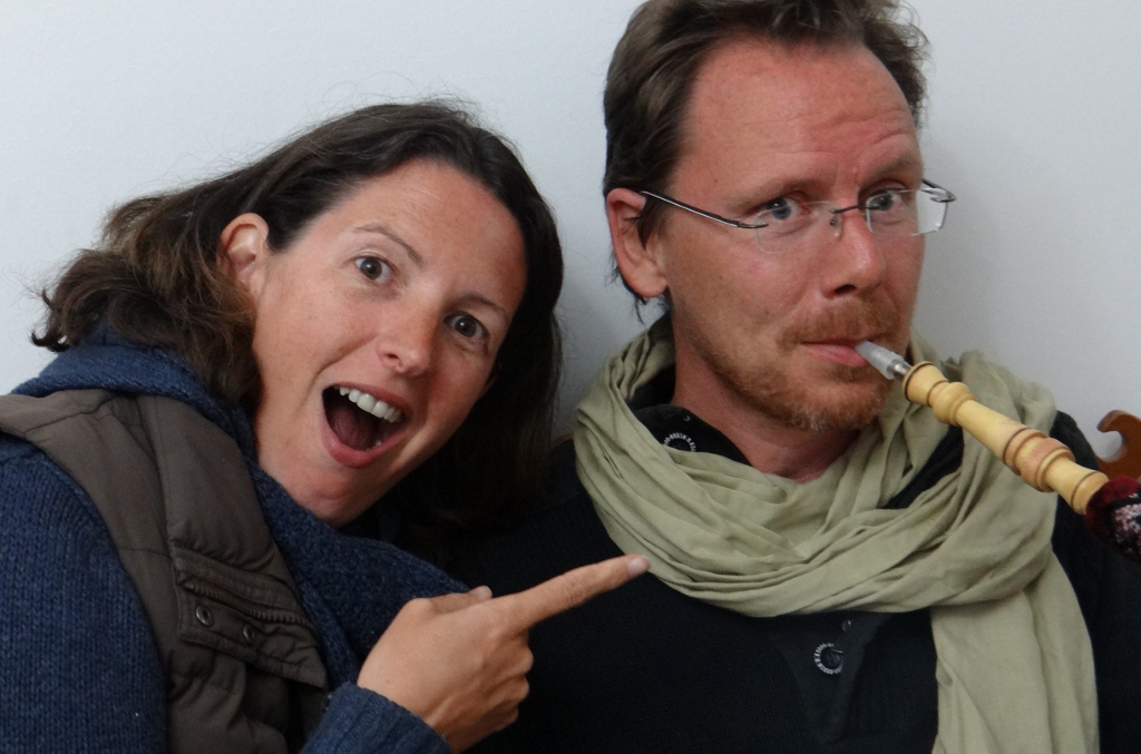 After dinner we moved into the main reception area where there are several sofas to relax on. The small fire, which we’d earlier doubted would ever warm the room, had shown it’s true purpose – it was for keeping the fuel for the chicha pipes hot. Stood around the sofas the waist high glass and metal contraptions were ready with tinfoil cones on the top containing hot coals from the fire. Neither of us smoke, so we were very dubious about having a go, but having seen so many people bubbling away in cafes, it needed to be done. Ismail had filled the pipes with apple flavoured tobacco (bitufaah), supposedly the best flavour, and we nervously took it in turns to suck on the disposable plastic end piece of our pipe, while holding onto the carpet covered handle.