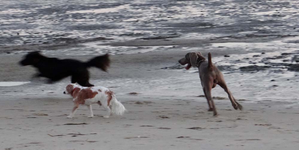 Charlie plays with his new mates on the beach (yeah right – Charlie tries to get away from the big dogs who want to play on the beach!)