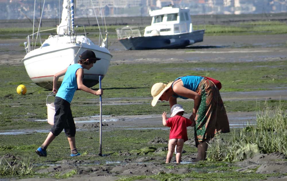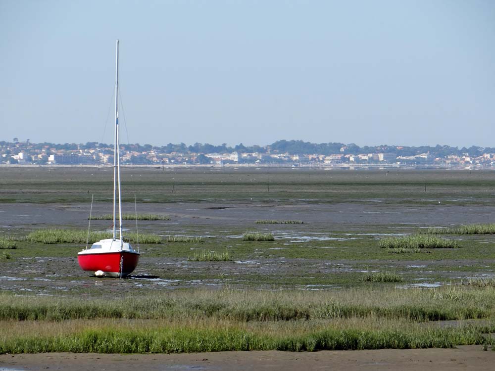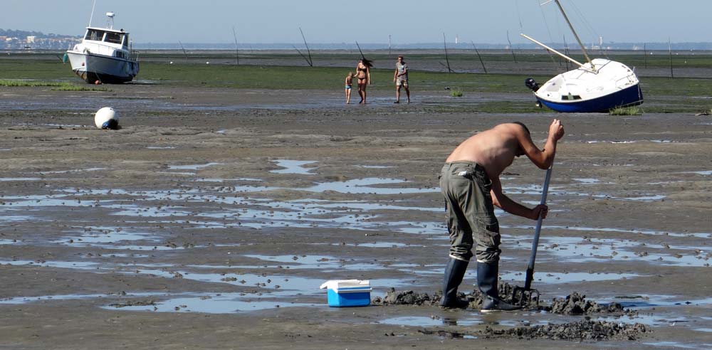 Reaching the beach at the far end of town we looked over the sea, but it wasn’t there. The tide had gone out, way out, further than even the Skegness tide goes – and that goes a long way! It was as if the entire Basin had been emptied. Boats of all types sat stranded on the mud while around them people dug in it foraging for free food in the form of shellfish. It was noon and starting to seriously heat up, so we stopped off at the boulangerie to grab a baguette and a couple of cakes and nipped to the Tourist Office for a map before heading back to Dave to shelter from the sun.