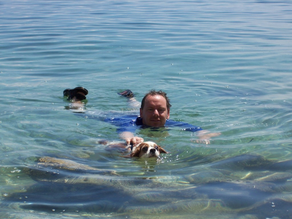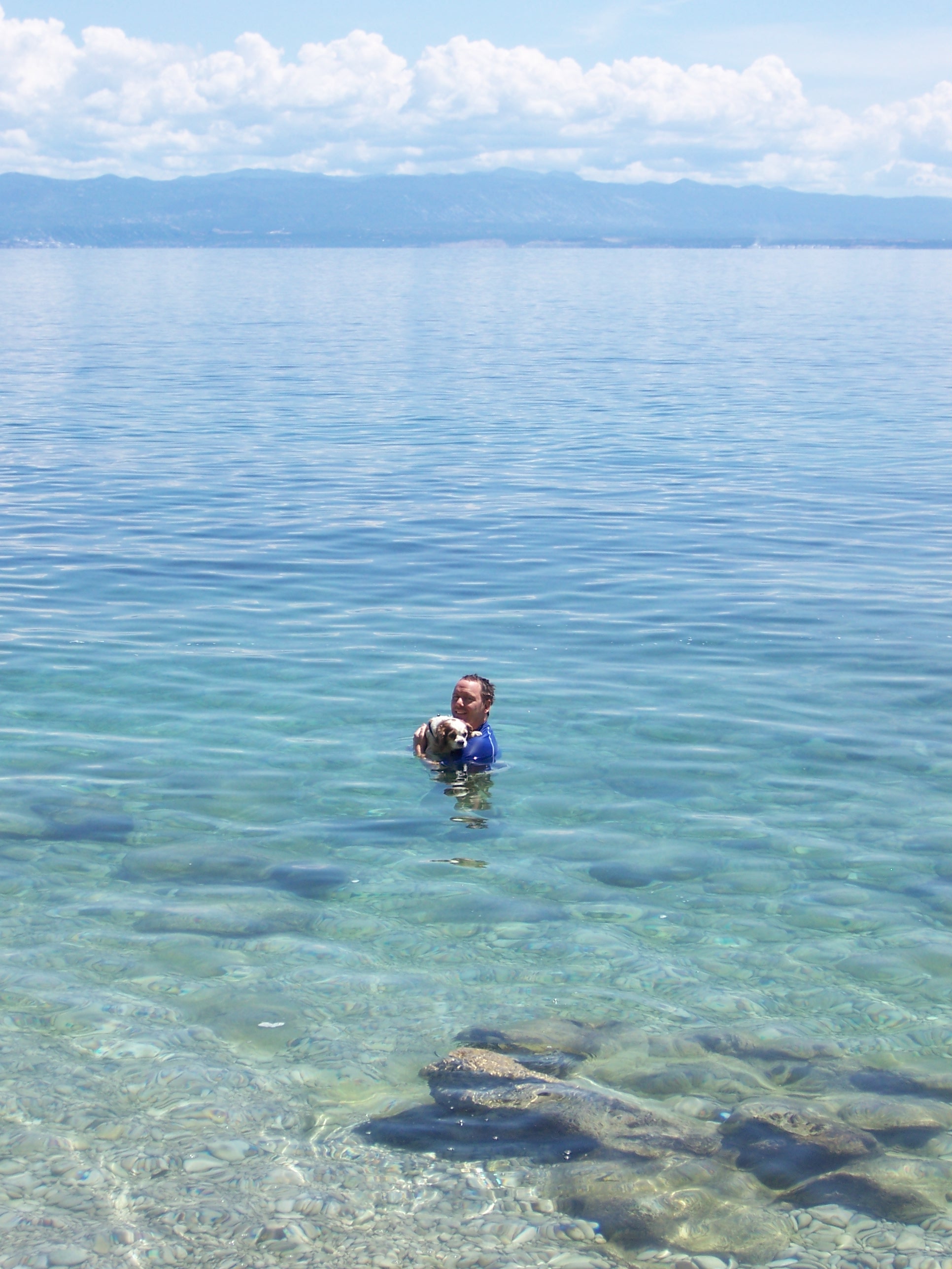 The main beach was packed. We found ourselves a nice little cove between some rocks to chill out in and set up camp. The beaches around here are stoney, so Charlie took great delight in chasing stones …. for hours. Jay got ready to snorkel then took Charlie in for a swimming lesson as the sun was beating down on us – yes by the time we’d done everything back at Dave it was now midday! I videoed his lesson, as you can see his legs know what to do even when he’s not in the water, and just ignore the look of terror in his eyes, we’re sure he’s loving every second.
