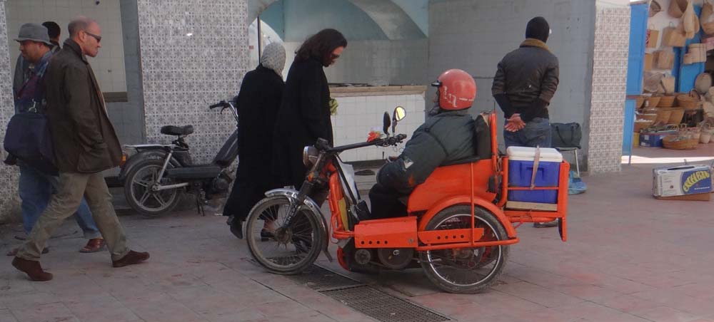 Motorised wheel chair, Tunisia-style. The guy was selling a tray of fish to passers by, while fending off a cat.