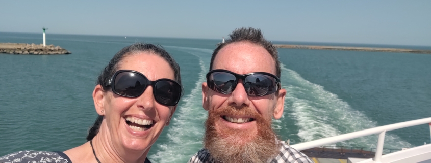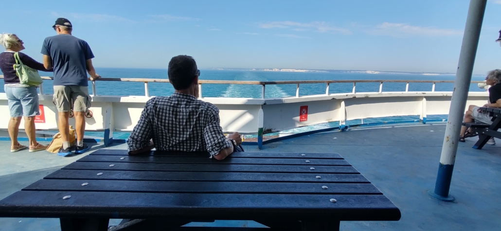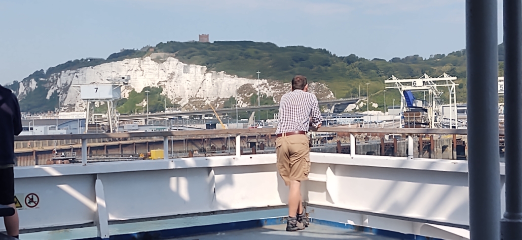 It was tight in the end but we made our ferry. I was just having a chat with neighbours who were heading off as a couple without kids for the first time in a couple of decades when the queue started to move. The boat left a few minutes early, probably because half the people were still stuck in the EES-booth-building queue. Under a blue sky we and half the other passengers occupied the rear deck and watched the white cliffs retreat. Always a good feeling this, the romantic sense of departure.