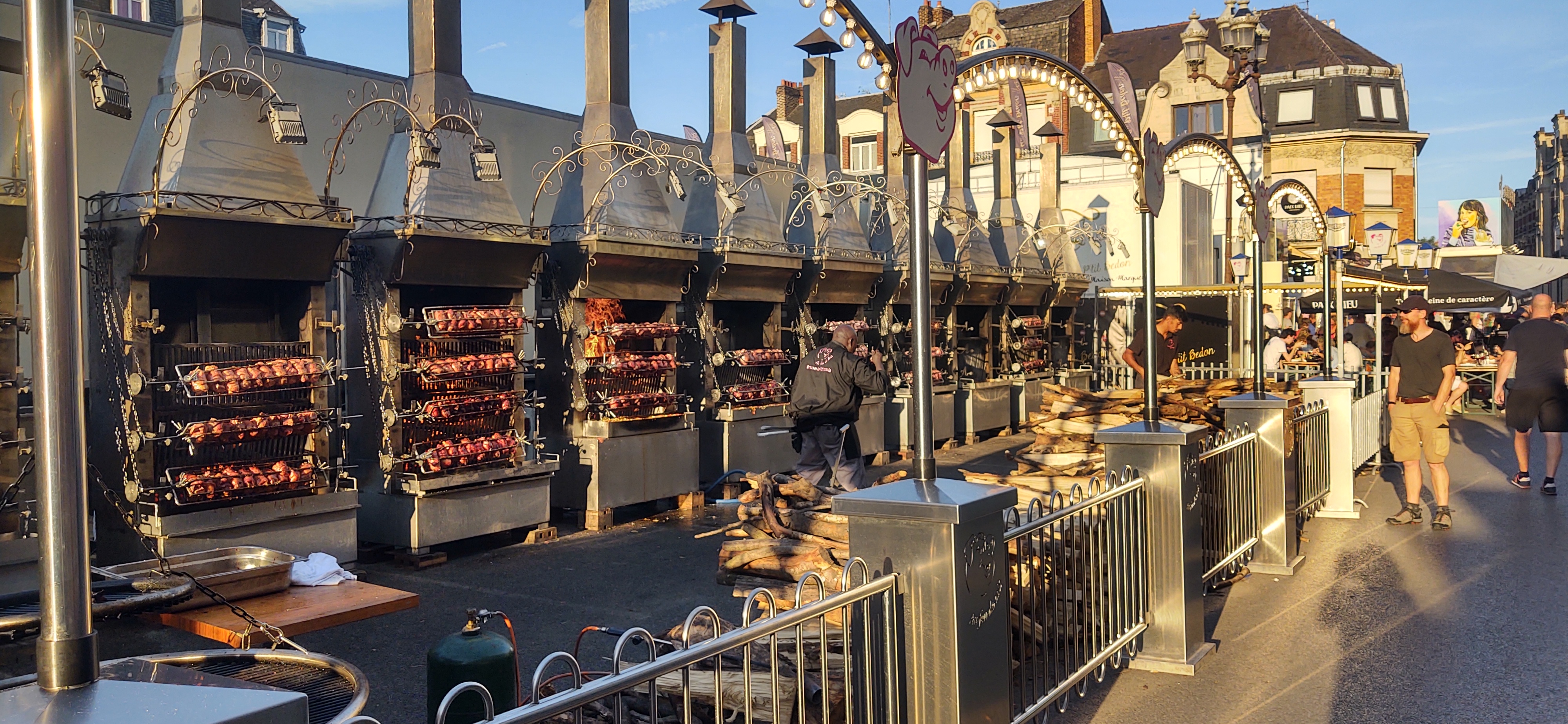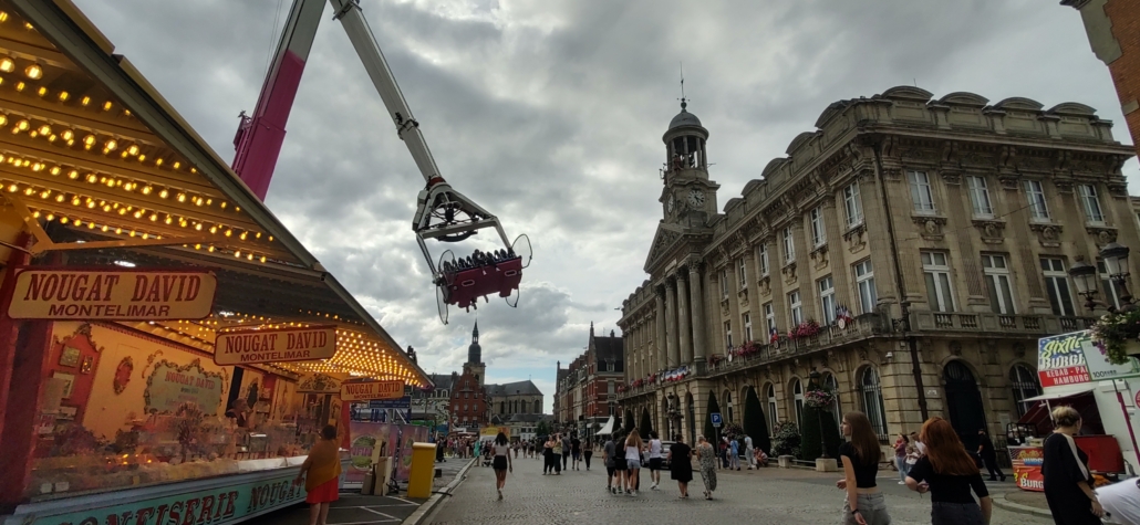 Unsure where to go, we picked Cambrai half an hour south, heading to the municipal site in easy walking distance of the center (there’s an unofficial map of these sites here). Like many of these low-cost, no-frills sites, reception closes for an endless lunch break. At this one it was from midday until 5pm, but they’re a practical bunch and allow you to drive in, get pitched up and come back after 5 and check in. Turned out to be a good place, a nice site and we were lucky to find France’s largest fun fair (literally) had pitched up across the entire city centre.