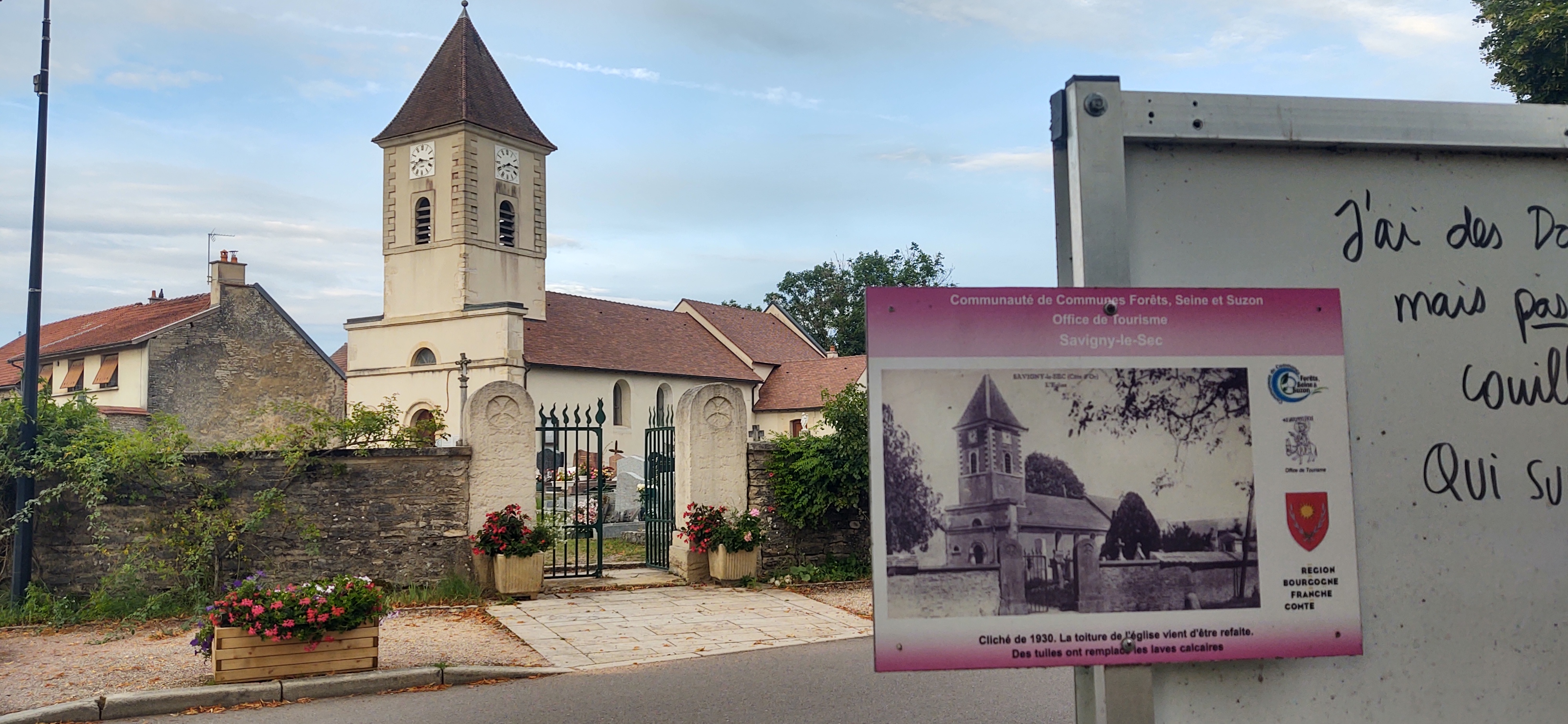 Engaging hyperdrive (60mph), we hit the toll roads and cruised for four hours or so down to an aire at Savigny-le-Sec, just north of Dijon. Again, there was nothing much there. A tiny village built in yellow stone, it was nice to amble around for a few minutes, looking at the chickens cooped next to the aire and old photos the locals had used to relay the history of the place, but that was about it.