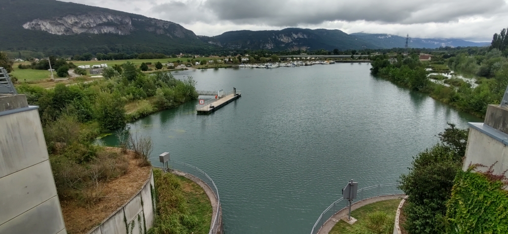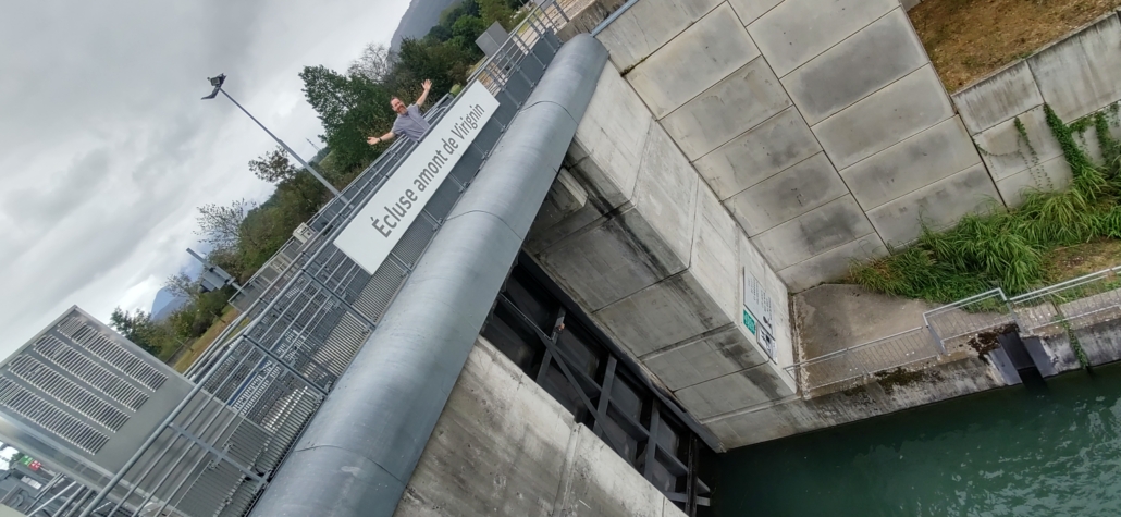 We decided to decamp and headed here via a small corniche road built into a cliff face, a taste of things to come I guess! It took me back to some of the crazy drives we’ve had over the years. Virignin is on the banks of a man-made river which flows from and back into the Rhone, created to power a whacking great hydro plant a short walk away as well as some huge locks. It’s a nice, calm spot, a marina and fields backed by cliffs with riverside cycle paths and greenery all around. We were lucky enough to get here in time to see the horse and trap competition that was taking place in the field next to the aire too.