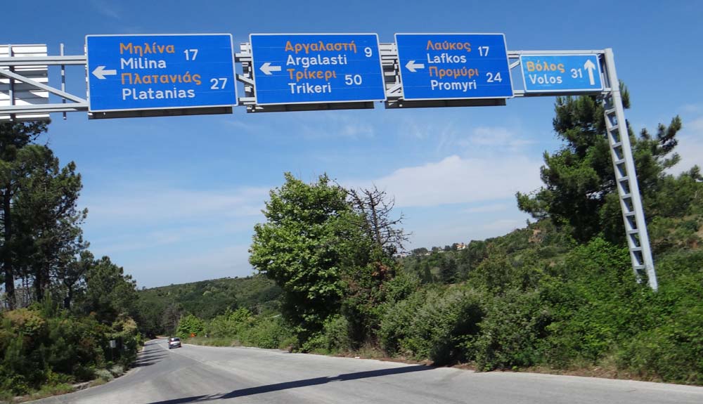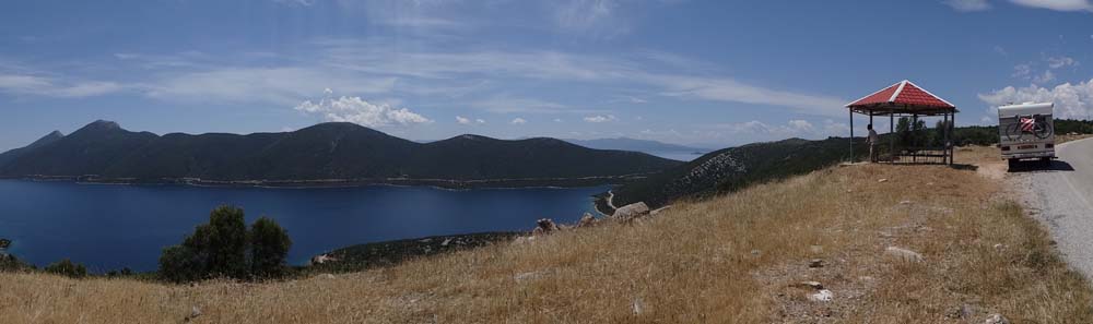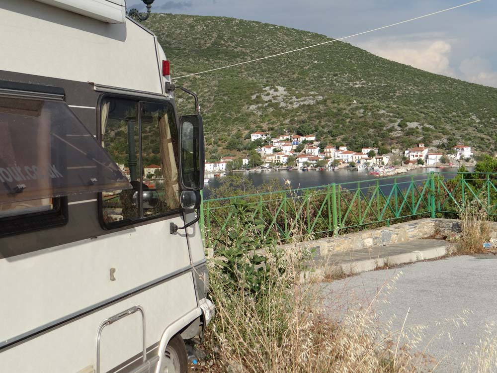 Dave the motorhome’s made it to the southern tip of the Pelion Peninsular, and is parked up alone on a small headland car park overlooking Ayia Kyriaki (N39.09313 E23.06513). We’re at the mouth to the Pagasitic Gulf, which is funnelling ships of various shapes and sizes past us as they head for or leave the big port up at Volos. We’re at one of those places which is hard to get to, so few people bother. It’s beautiful.
