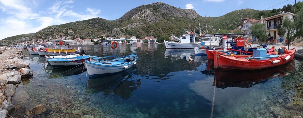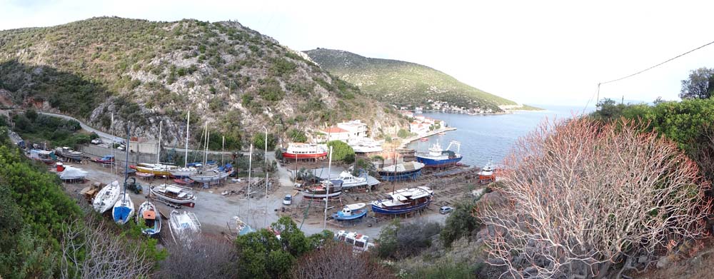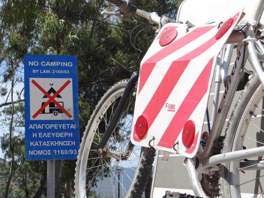 Over the hill and around the corner: Ayia Kyriaki appears. If you look the name up on WikiPedia then somewhere in the Dodecanese islands appears. We’re not there. This place is a small community of folks who live on the edge of Greece, itself on the edge of Europe. The big fat road brings in us tourists, but there are only a couple of tavernas, a big boat yard seems to provide the mainstay of employment. Oh, that big fat road, well it ends just as you get into the village and turns into an iddy-biddy thing, a Dave-trap, as it disappears into the back streets of the village. There’s a lovely sea-side car park on the other side of the village (ah, that’s where the left fork lead to) but no way to get to it unless we backtrack a fair few miles, hence we’re in the scruffier spot this evening.