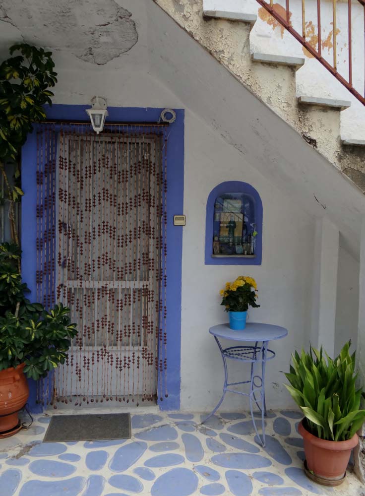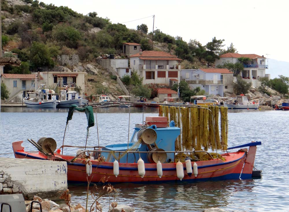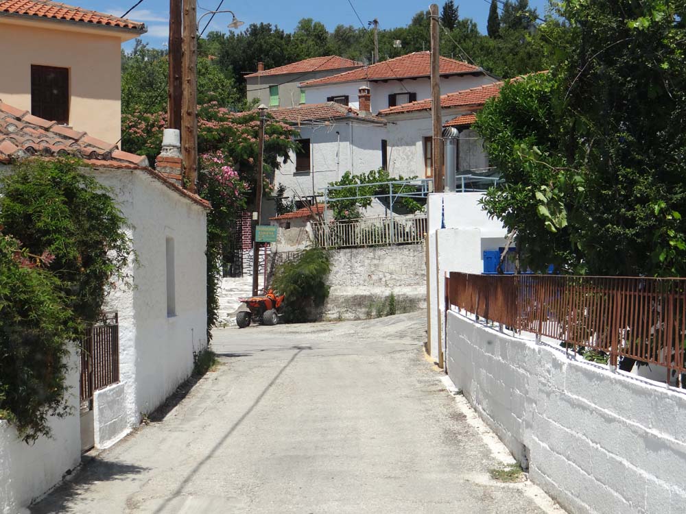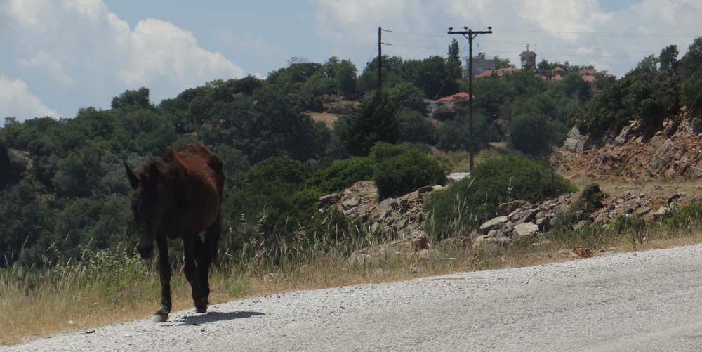 As the route cruised alongside the sea, we came to an unexpected junction just before Trikeria. Left would cut out a loop around the pointy end of the peninsular, and take us to our destination more quickly. But this would miss Trikeria, which our old-as-the-hills Rough Guide indicated might still be a land of donkeys. Right we went.