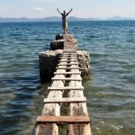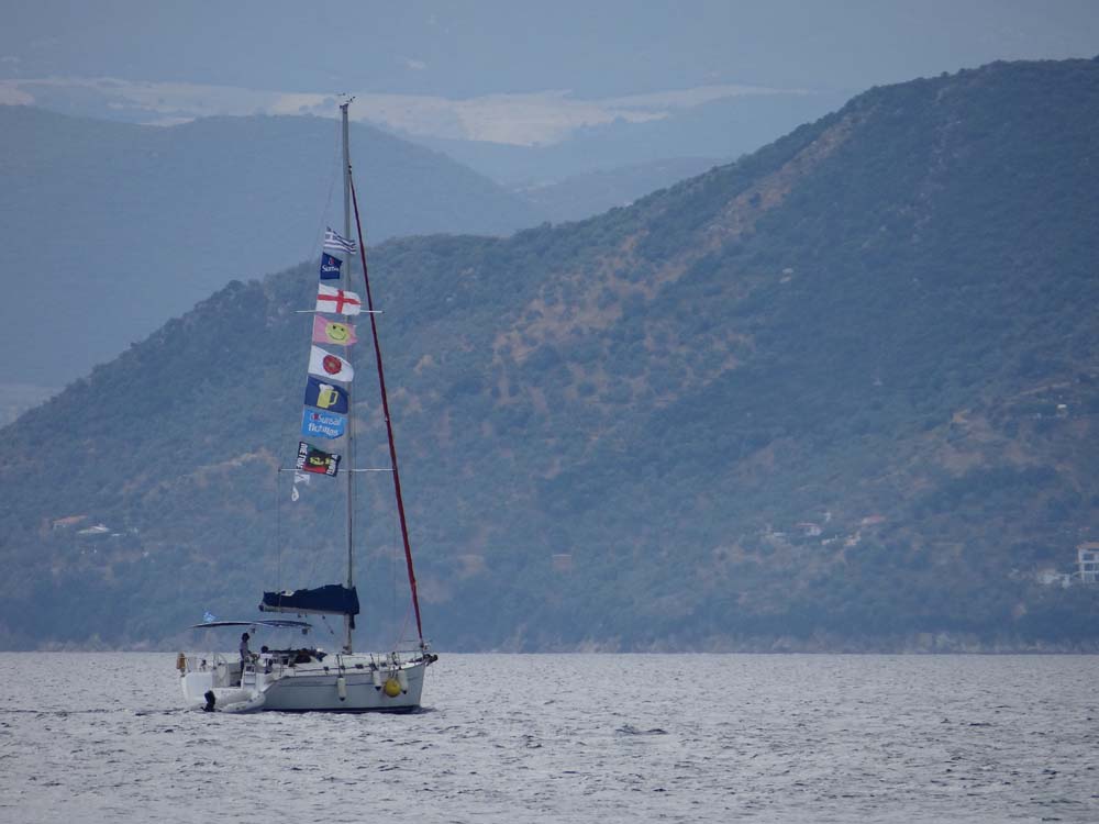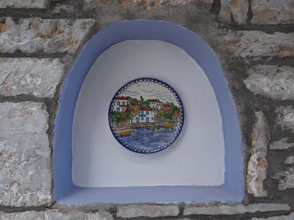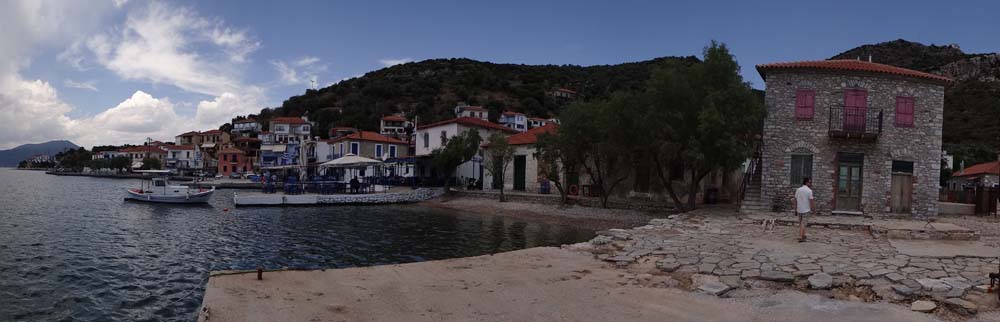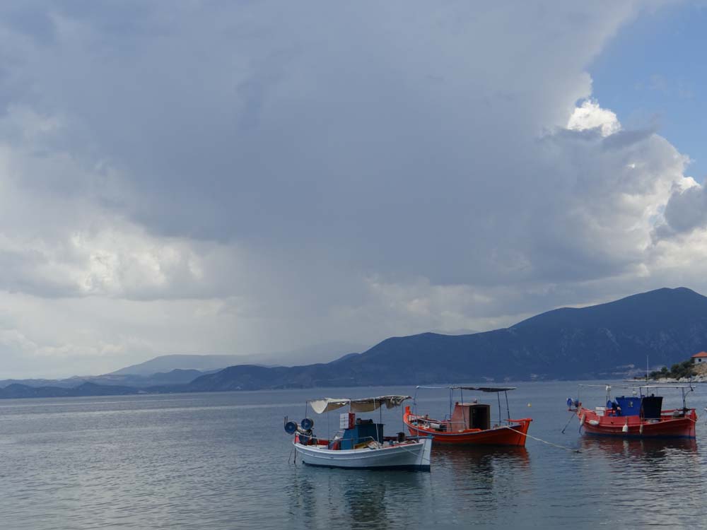 The Rough Guide talks of this being the most attractive spot on this coast and it’s not wrong. Even in the rain and thunder, which forced us (ahem) into a taverna for lunch and a spot of Hellenic lager, couldn’t dampen the view. The waiter (who happened to have the same name as the owner, err, hang on, no he owns the place) spoke great English and was wandering about demonstrating excellent low-pressure sales technique. He let himself down a bit when I asked him for details on how to cook the ‘pan-fried’ feta and tomato dish we loved: ‘ah, its easy you just stick it in the microwave’!
