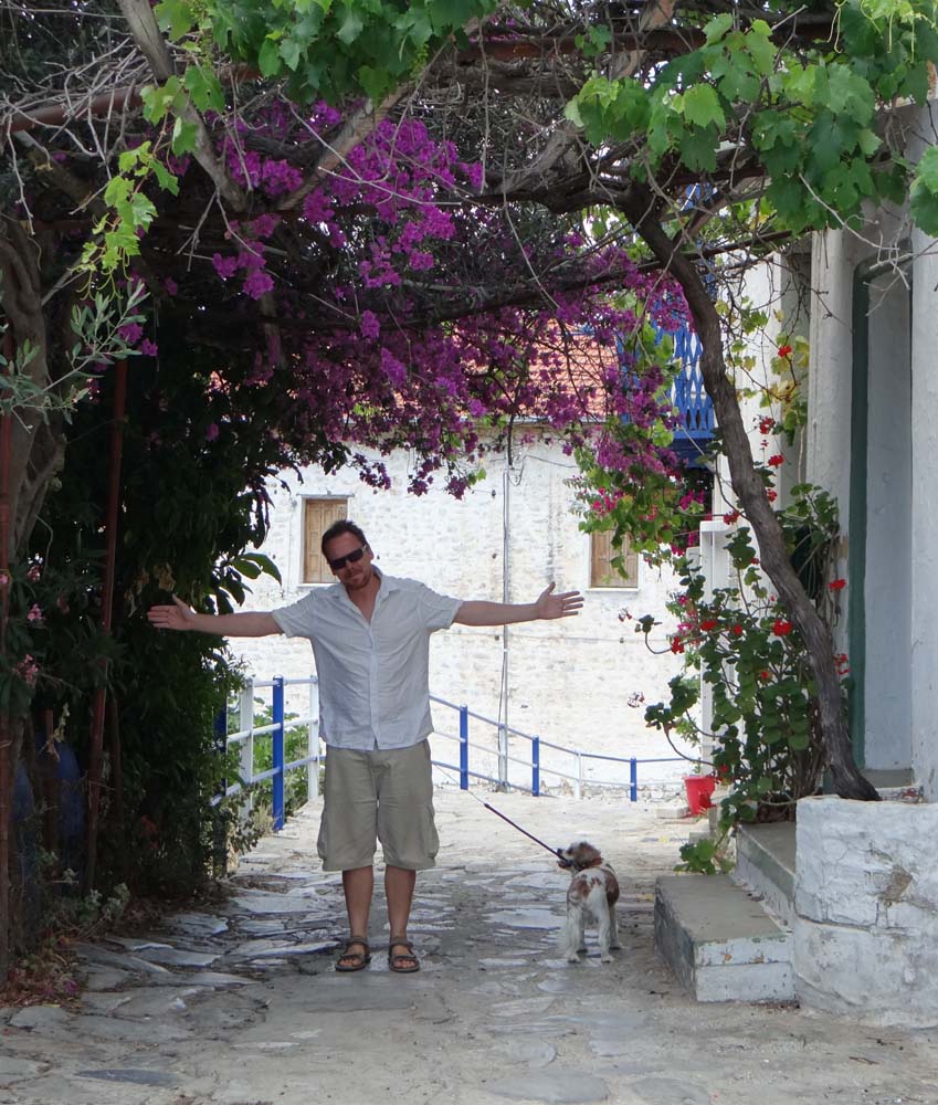 This morning’s beautiful dilemma: which way? All along the east coast of the Pelion there are to-die-for coves. They’re each reached by the long road which branches from the main north-south track, and on leaving the place you have to drive all the way back to this main route. The only coastal routes are dirt tracks, good for donkeys and 4 by 4s. We’d had the perfect cove, the ones further south could be no better, and we fancied seeing some people, so we decided to make a run for the end of our current stretch of land.