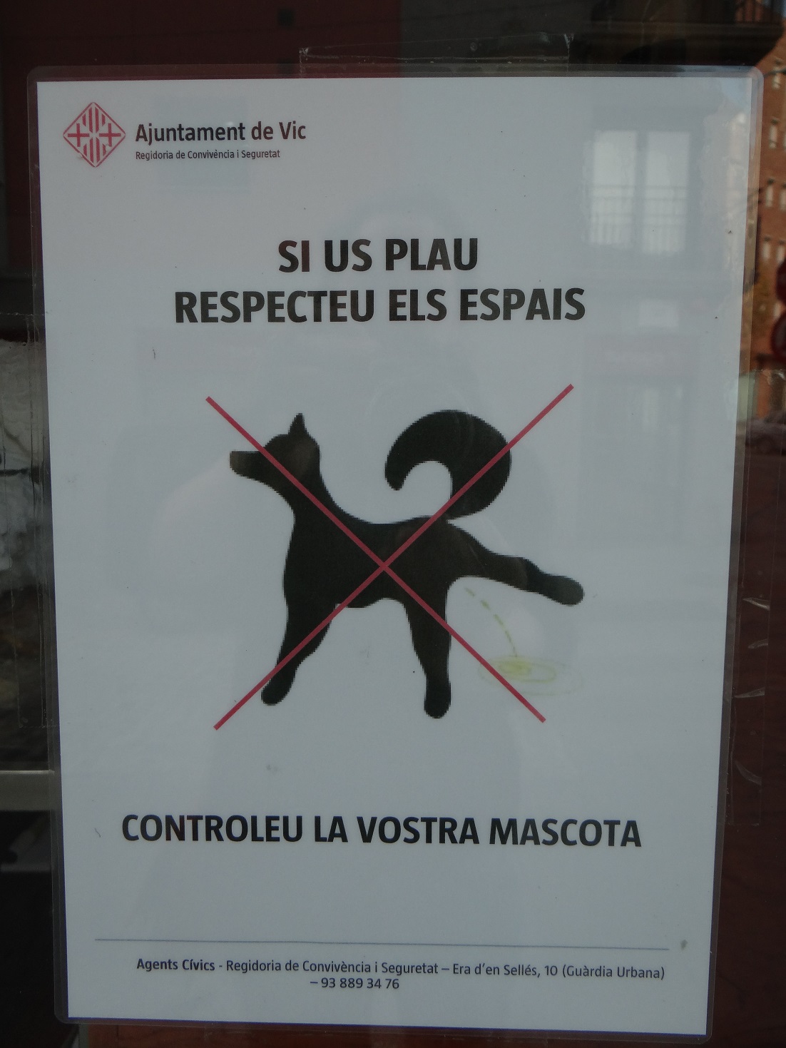 It’s just a mile walk into the centre of Vic from here, past the town’s university and cleverly adjacent bus and train stations. Ju sniffed out the tourist info and popped in. I found myself in the tractor-beam of a hard-sell sausage flogger, following the shouting tat-flogger like a zombie into his shop. He was talking Catalan, or was it Hungarian? Whatever it was, the message was the same: “bring your dog in, no problem, look-no-buy, I do you good price etc etc”. Cured sausage is a speciality here. He cut off not one but four slices. I ate one: it tasted nothing special. I wondered how to escape. Ah yes: Ju, I’ll use her as an excuse, genius. “Dos minutes”, I hold up two fingers as I tried to drag a wide-eyed meat-sniffing Charlie to the door. Purposefully misinterpreting the seller held up two massive sausages. My turn to go wide-eyed: “No, no, I’ll come back” – all pretence of Spanish/Catalan/whatever language speaking was gone.