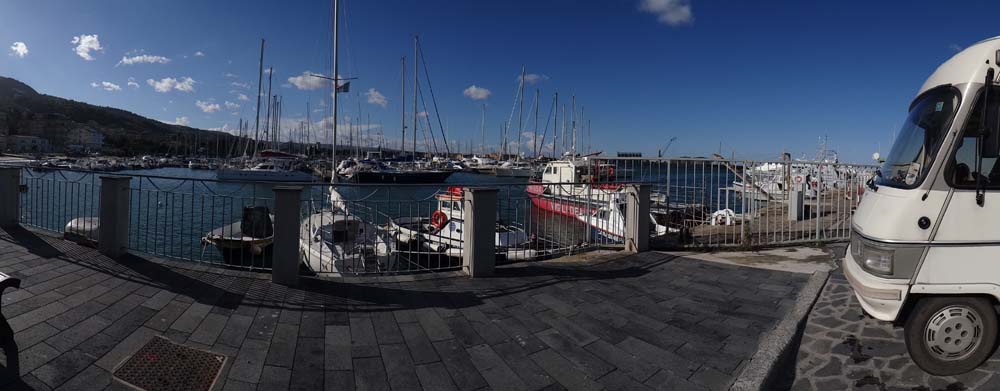 A short distance further, the roads staying main-artery wide, we dropped down into a plush-looking harbour at Vibo Marina, pretty well packed out with gleaming yachts and coast guard vessels. A hunt around found a tap with no handle. Taking the pliers to it revealed an unappealing yellowish-tinged liquid. More hunting, venturing into the fenced-off port area found a working tap with clear water. The cobbled surround to the port right next to a small beach would make a nice place to stay, but we’ve been reading about Sicily and Tunisia; we’re excited.