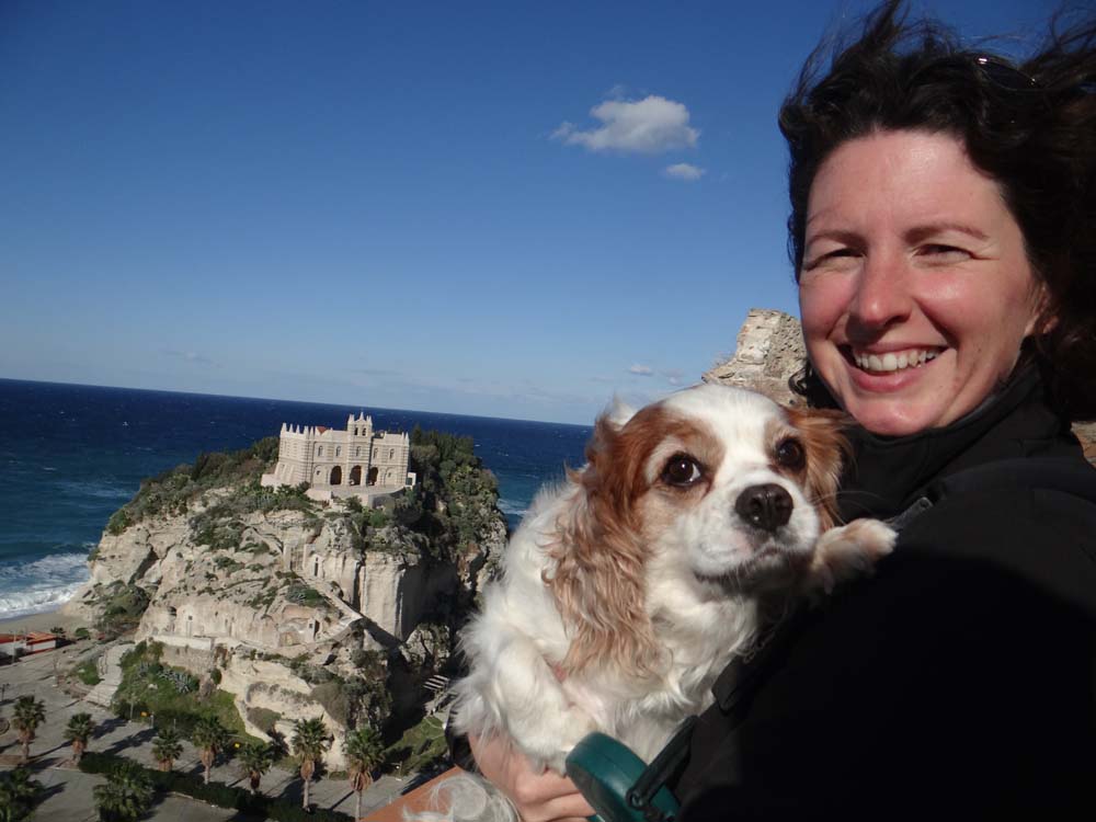 Our last stop for the day brought us to a fabulous spot here in Tropea, it’s like a Tuscan hill town-on-sea. All Smart-car sized stone streets, not a sign of tarmac, and crumbling buildings. It’s also pretty much closed, despite making a couple of trips up the steps to see it, the trattoria and resturante remain firmly shuttered. Sad in a way, since it feels robbed of life, but it gave us the streets, panoramic views and this fabulous parking place pretty much to ourselves. Life’s good. Charlie agrees, having hunted down and savaged a thousand sticks.