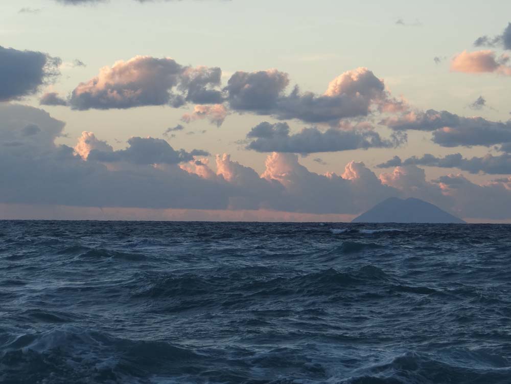 Mount Stromboli, one of Italy’s three active volcanoes, you can visit it, but the sea looks viscous! We spotted what appears to be a twister to the left of it.