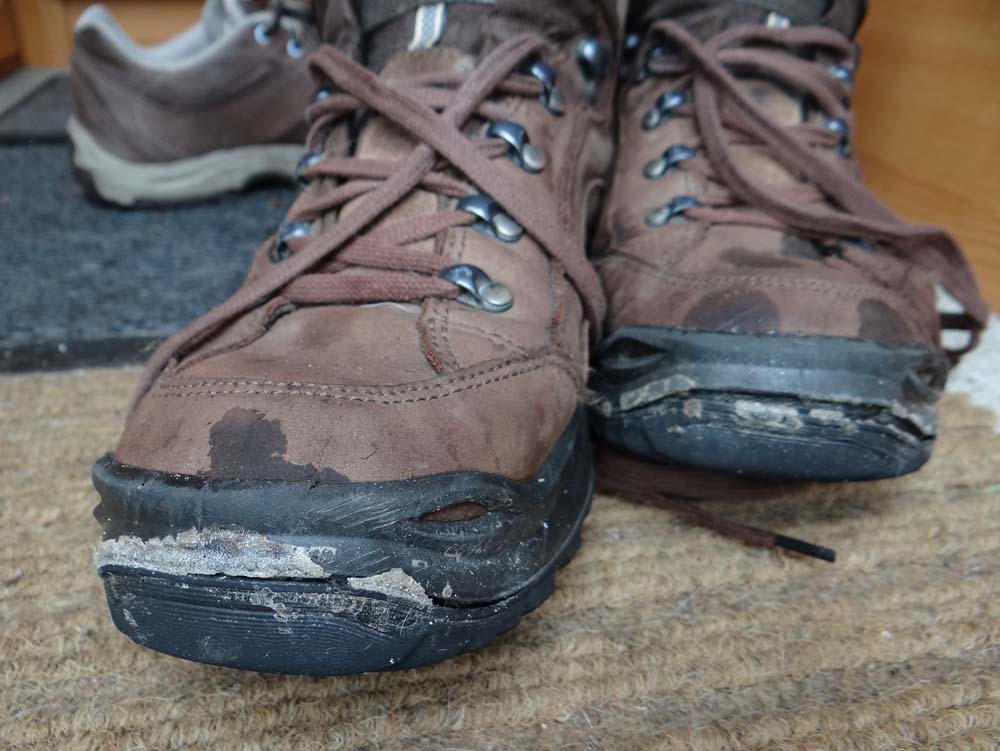 Decathlon boots after a year on the road. The soles are detatching themselves at the front in a fetching smile. Sadly this means there IS a hole in my shoe YES, it is letting in water.