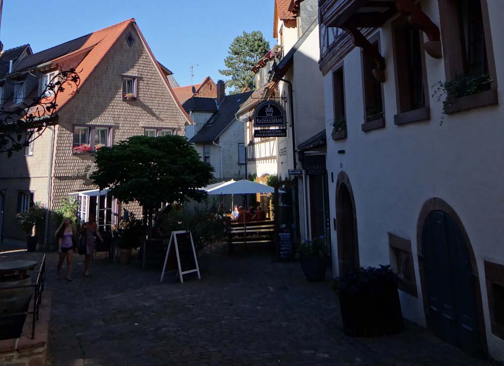 Down a cobbled side street we spotted a nice looking pub with seating outside, and seeing as the town was so good to give us free parking we figured it would be rude not to sit in the shade of its umbrellas and have a soft drink. The waiter arrived with the menus and we discovered that we were in Michelstadter RathausBräu – a brewery – so it would have been rude not to have a beer! Jay opted for a large black beer and I went for a small radler (shandy) white beer. People around us were eating and the food smelt so good, but we were strong and stuck with just the beer – there’s some pork defrosting in Dave’s fridge and we’ll no doubt be eating out with Jacqui and Marc. We also stayed strong as we left as you could buy take out beer – €97 for 100l of beer – that seems like a good deal to me!!