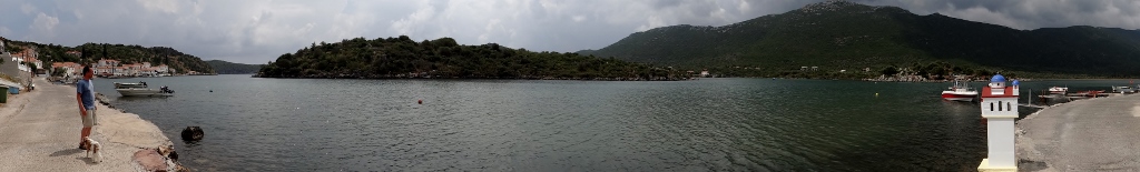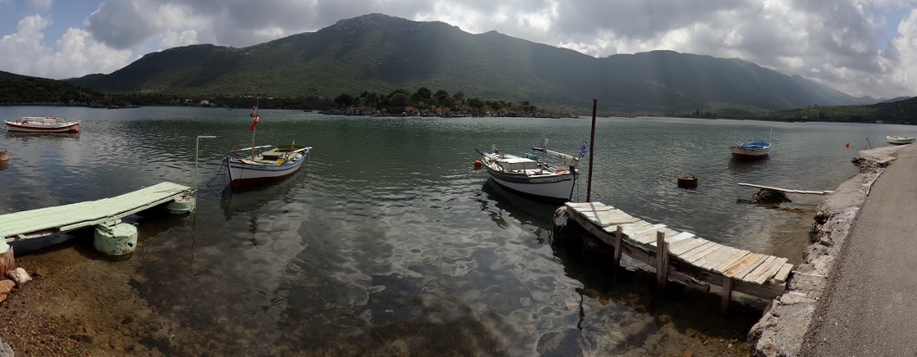 Soon we were winding our way over hills covered in dark green shrubs, where the road was cut into the hill grey rock rose up, the earth among it was the bright red colour of the cliffs on the coast. If the grey clouds above were blue sky it would have been a most beautiful scene. A couple more villages were easy to get through, no tight ‘pinch points’ here as the few pale pastel coloured houses lined the side of the single road. Dropping down towards what looked like a huge lake we realised how close our destination was (we’ve only driven around 650 kilometres in over a month in Greece as there are so many amazing places to see), as a small collection of houses sat on the shore.