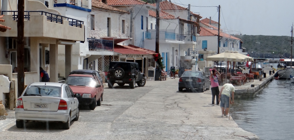 Finding a nice big car park we left Dave and set off on foot to see how wide the road ahead was. The single track ran against the water’s edge, with houses along the shore until we reached the main part of the town, where a few tavernas had their tables and chairs out a foot from the quayside edge. Assessing that it might be a bit tight due to a couple of parked cars, but worth the attempt we wandered back to Dave and pottered along the road to the car park at the end; Gerakas Port. In the port there was only one boat was anchored up, a young couple lay sunbathing on its deck. But all along the roadside fishing boats were tied up and piled high with nets.