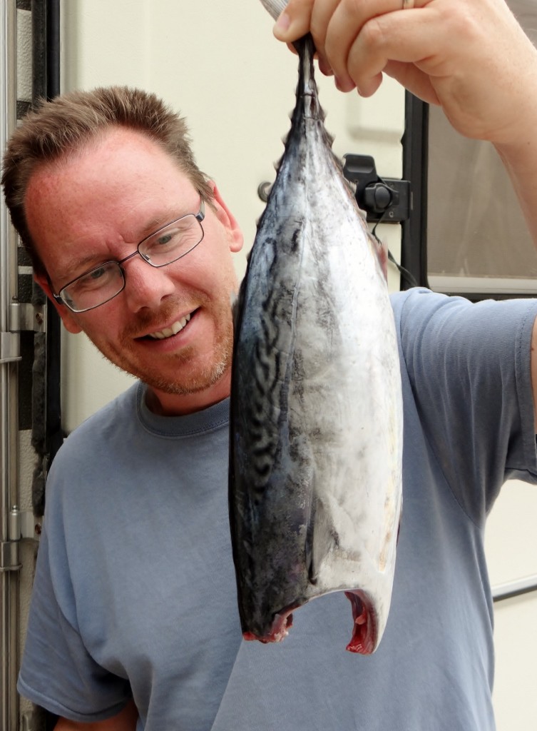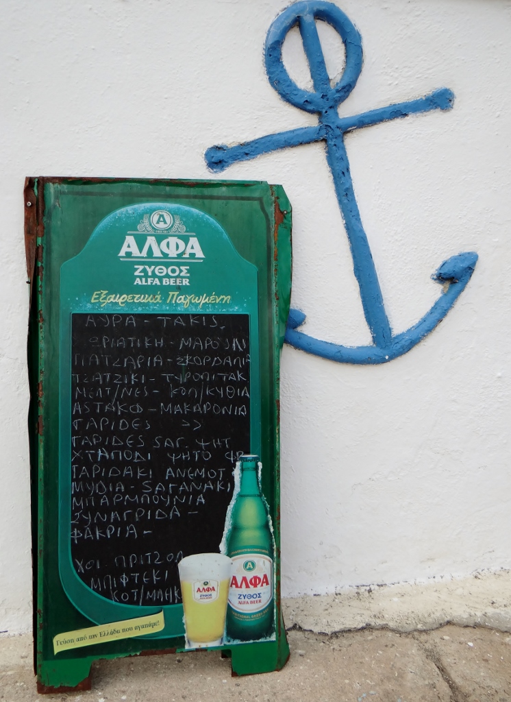 After a bit of confusion and some sign language we bought ourselves a fish, which was then taken outside to be de-scaled, gutted and cut almost in two by one of the proprietor’s friends. ‘Ten minute grill’ we were told, I tried to explain we don’t have a grill, but I’m not sure it was understood. The weighty fish cost us just €5 and we headed straight back to Dave to cook it, even though we were early for lunch by Greek standards.