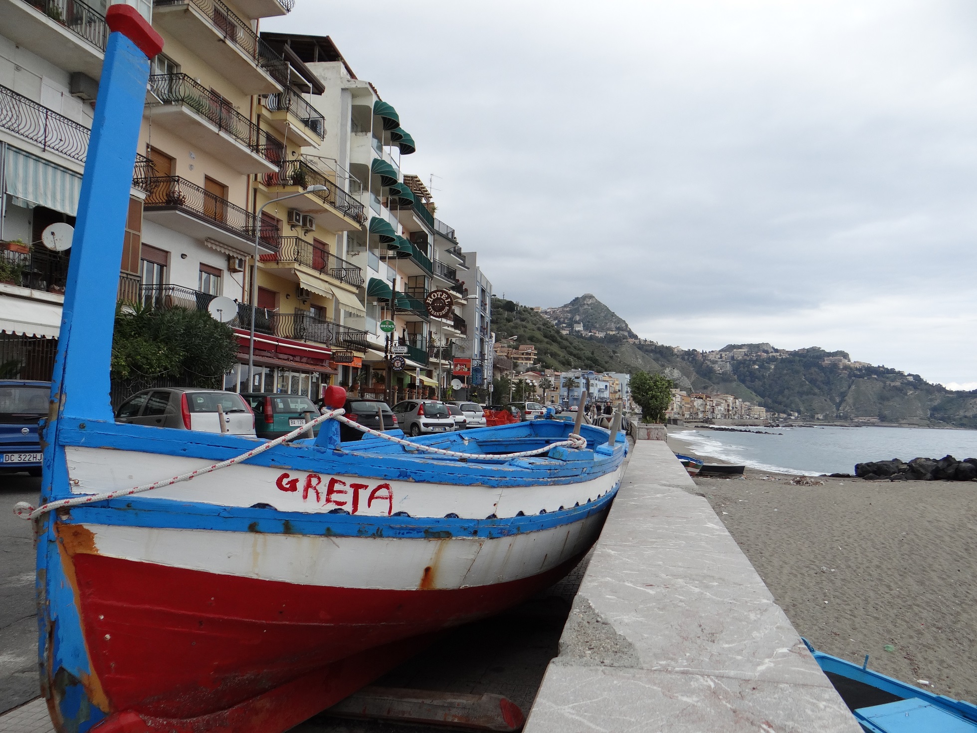 Fishing boats dragged up onto the pavement at Giardini-Naxos. Not everyone makes they cash from tourism here.