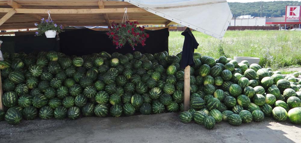 People scowl as we drive past, but when they see us smiling at them, they smile back – the scowl we’ve taken to be more a look of confusion than aggression. It’s not surprising though, we’ve only seen two other motorhomes today and we’ve covered a fair few kilometres. At the roadsides people sell whatever is in season, right now it’s watermelons – hundreds of them. We’ve also seen people with buckets filled with mushrooms, red berries, blackberries and a few small dishes of strawberries – we won’t go hungry here.