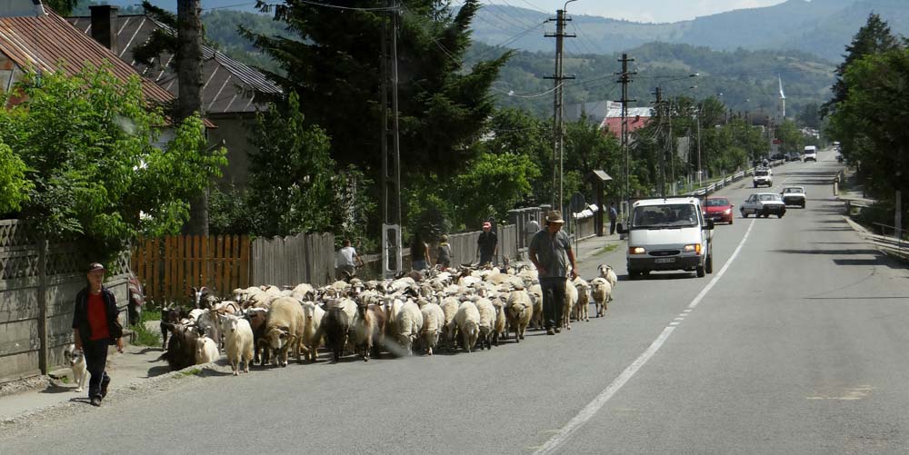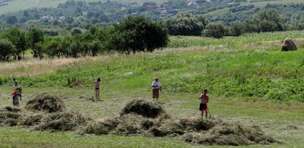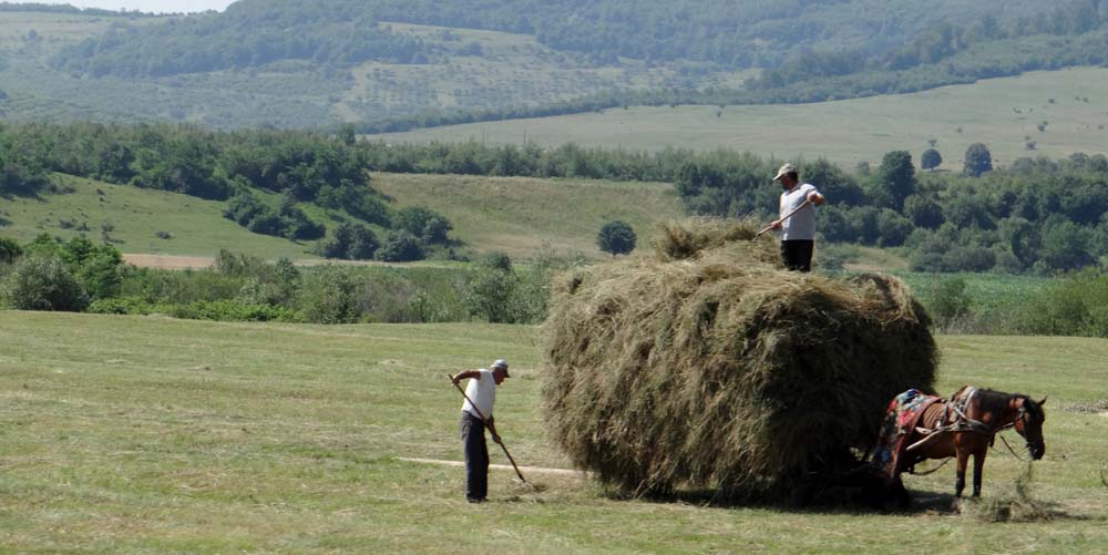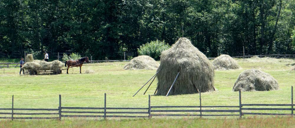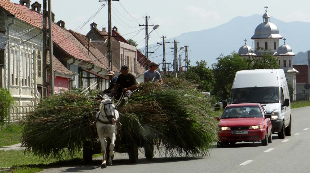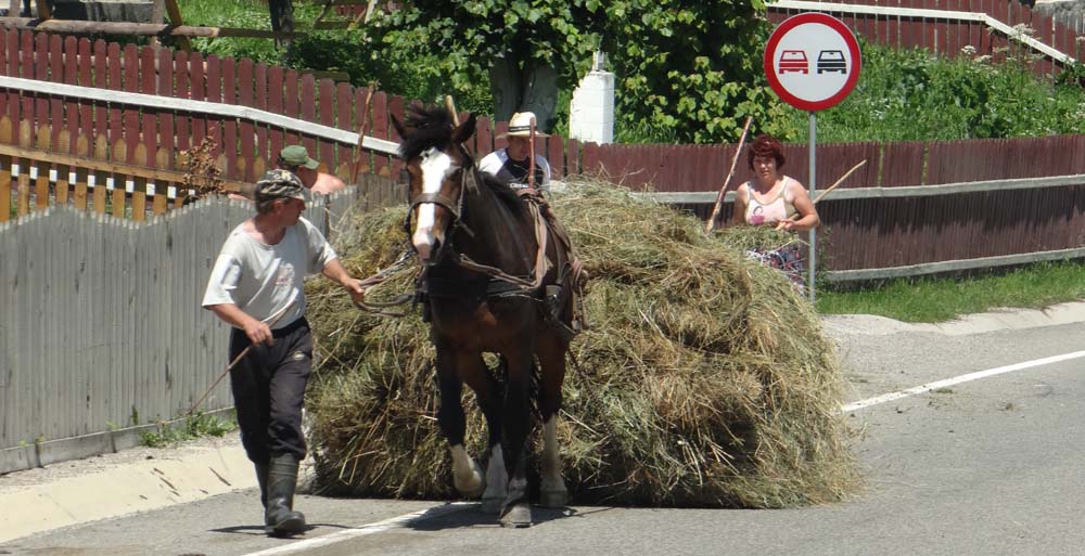 The countryside was alive with families cutting the meadows, collecting up the grass, transporting it by horse and cart or piling it high into haystacks, funnily enough about the size of Giant Haystacks himself! It is as if you have stepped back in time as you look out across the fields, but then you spot someone sitting on a cart on their mobile phone as the horse pulls them along, or a bloke’s Mercedes parked at the top of the field as he brandishes a scythe further down the meadow. The whole place is a very strange mix of eras. Newly painted houses with polished chrome handrails on a summer verandah sit across the road from a wooden house with chickens pecking in the dirt of the courtyard, it all takes some getting used to.