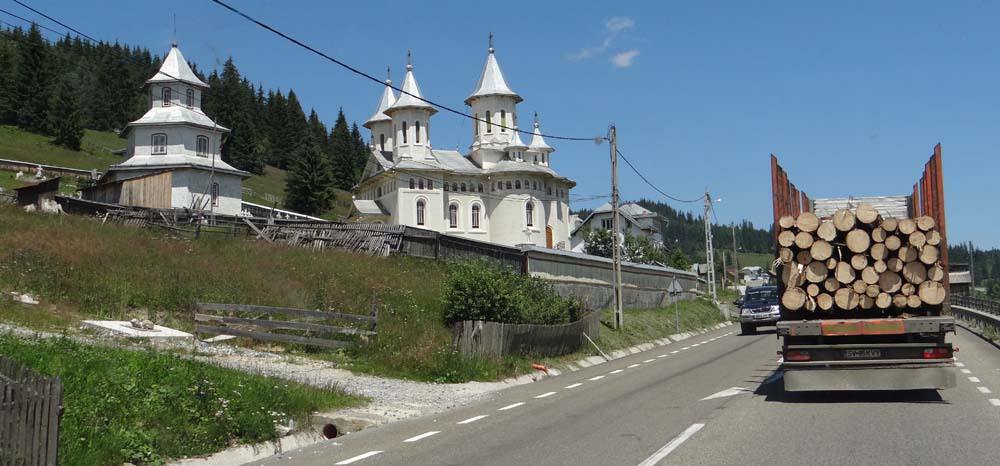 Reaching the town of Capulung Moldovenesc it was just after 1.45pm and Charlie was leaning over into the cab area wondering where his lunch was. We pulled in at the side of the road and fed him, then went for a walk around the town. The Tourist Information place was closed, so we studied the maps on the boards outside as an old chap who was already a tad worse for wear wobbled over, steadied himself on a post and tried to offer us advice in Romanian. We pointed to the big green ‘you are here’ dot, he pointed near the big green ‘you are here’ dot, we smiled, nodded at him and thanked him for his help, he smiled at us and saluted then headed back to a bench in the shade.