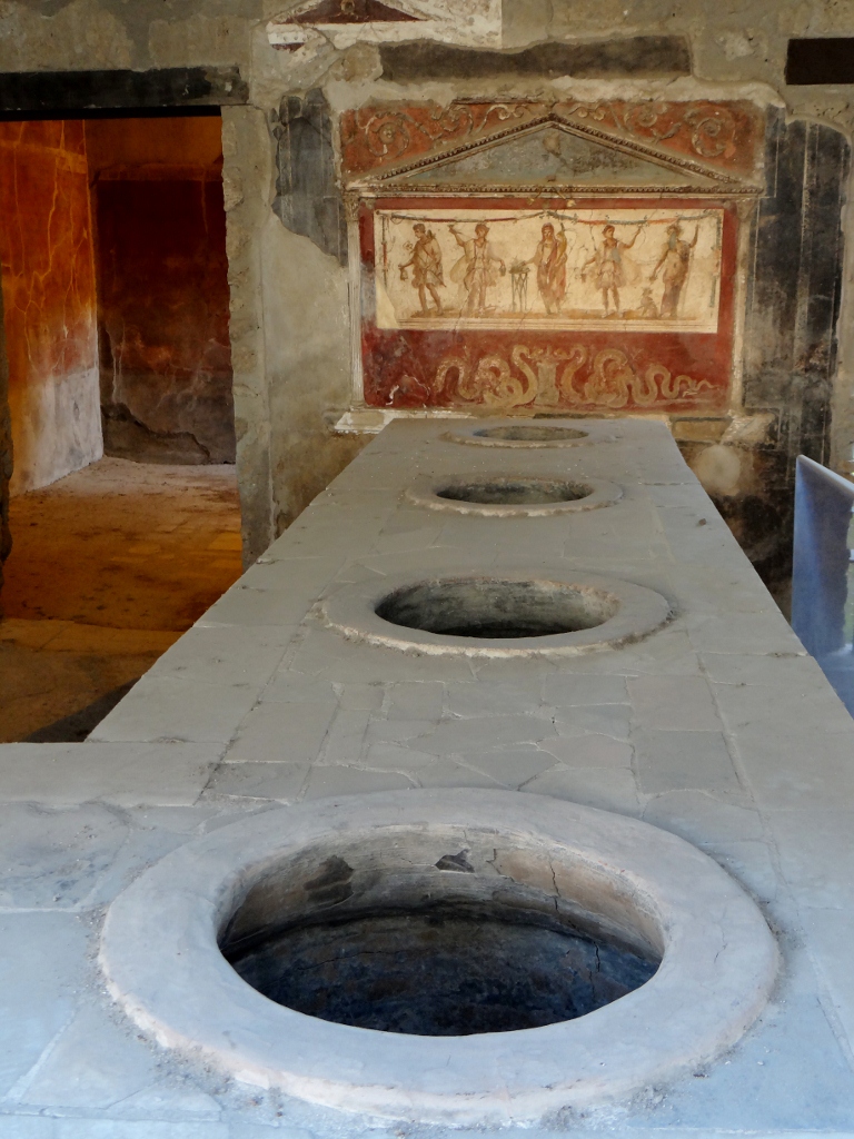 Houses with signs written on them – slogans or names, a grid like structure of streets lined by tall house walls, the streets rutted from carts and huge stones in places for traffic control, fast food stores with holes in the counter for bowls to hold the food, mosaics on the floors, frescos on the walls – yet it’s all thousands of years old.
