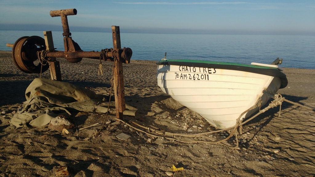 Ancient fishing boats and winding gear on the Cabo de Gata beach alongside us