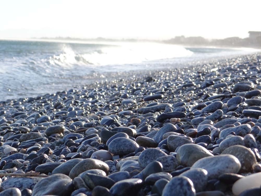Finding ourselves on the southern side of the much-mentioned toe, we drove along the road a little way to find a quiet spot and pulled in. As the wind continues to hurl itself against the waves, I decided to go get some photos. As I leaned down to get close to the edge of the water a gust plucked my lightweight specs from my noggin and placed ’em on the cobbles next to me. I leaned down to pick them up just as a wave rushed in, and dragged them back a foot or two. Half blind I had another go at retrieving the little rays of visibility from the grasping waters, this time finding my legs a foot deep in water and my hand full of stones. Good job Ju packed a spare pair.