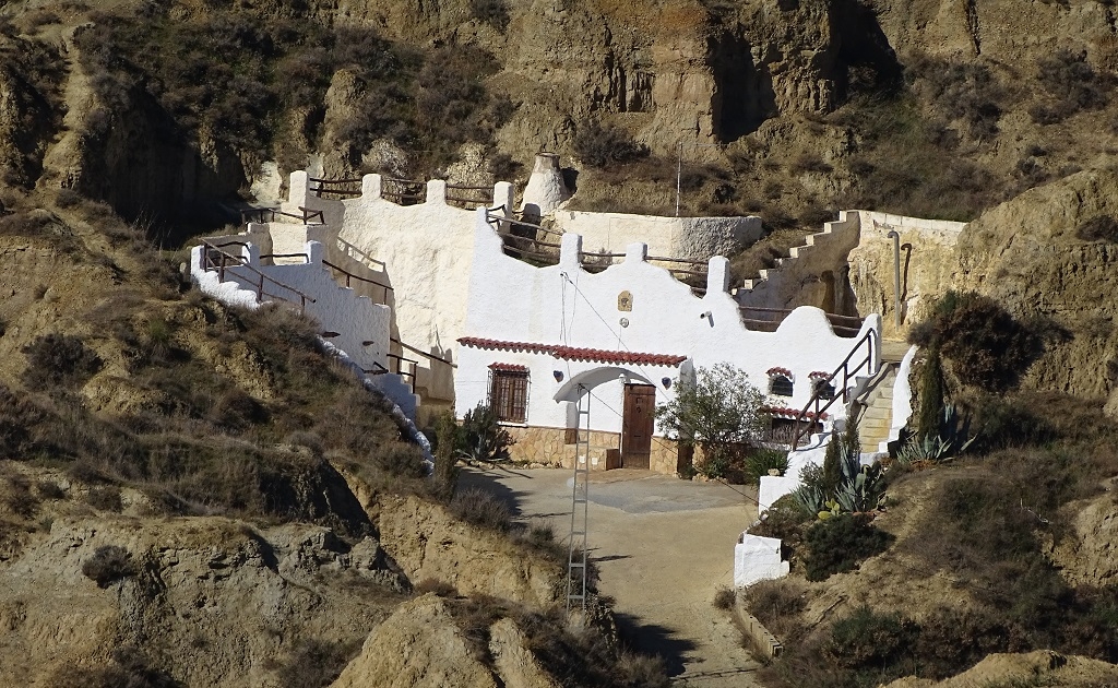 A map from the tourist office shows three viewpoints, of which the Mirador del Cerro de la Bala is by far the best, with views out across the hard mud Badlands and white-washed cave entrances and chimneys, with the snow-coated Sierra Nevada as a magnificent backdrop. The two of us spent a good half hour up there, trying to take in both the details and the expanse of it all. On the way, a couple of locals sat warming up in the morning sun had given us a friendly buenos, offset by an angry wee dog way below us. The tiny beasty barked herself braver as she made her way up the hillside a few tiny leaps at a time to see us off her patch, making us both smile.