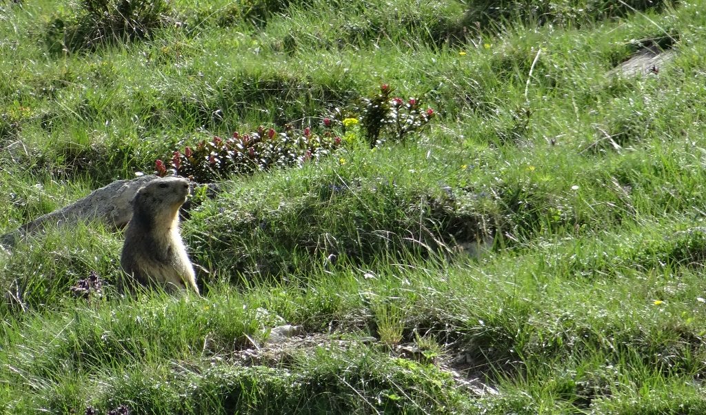 We’ve been here since Sunday and, given the facilities (of which there are none) and time, I’d stay a month. The natural beauty is a wonder. The sun’s shining, but the air’s cool. Marmots are squeaking on the hill along side us, mostly invisible but for a couple of hours when two of them pop up, staring down at us all, comically bounding up and down the slope. The patches of icy snow which had survived this long down at the parking level have melted since we’ve arrived, and it’s now a run up the Galibier if you want to grab some for your G&T!